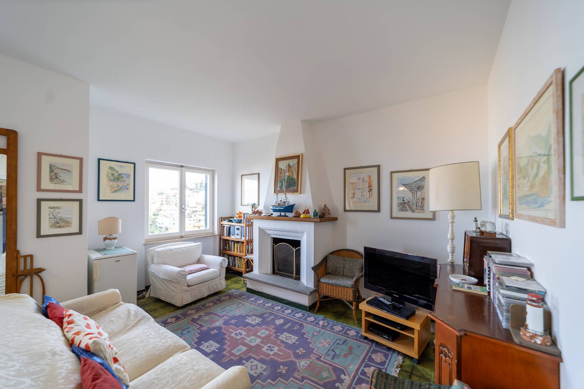 Lingresso conduce a un ampio soggiorno con camino, ambiente accogliente e ideale per momenti di relax e convivialit, che si apre su un ampio balcone vivibile, perfetto per godere del panorama mozzafiato sul mare. La cucina, separata e ben organizzata, dispone di un balcone di servizio.