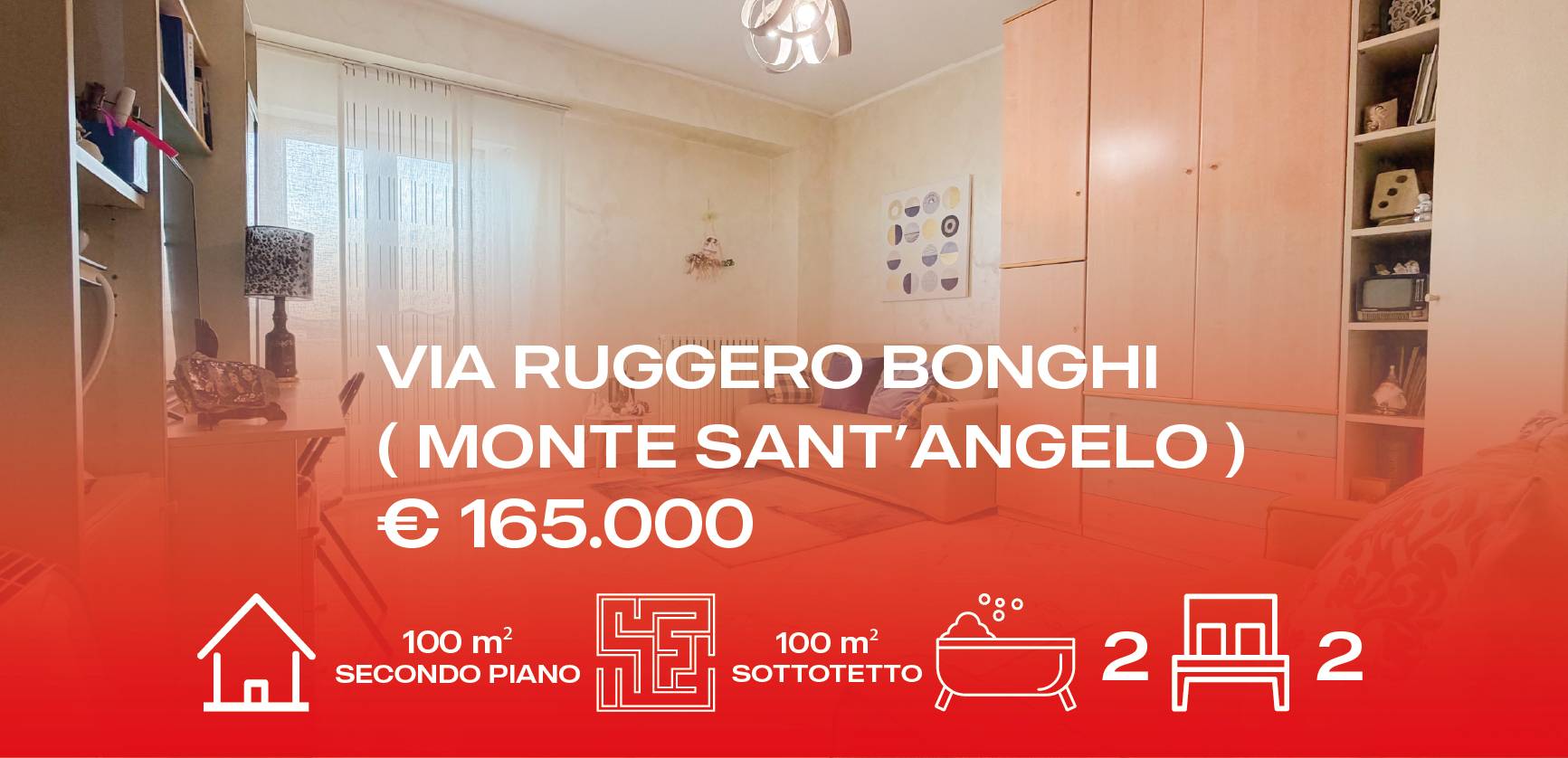 100 metri quadri secondo piano Doppia esposizione, per luce e aria durante tutta la giornata 2 camere 2 bagni Ampia zona cucina, perfetta per vivere la casa ogni giorno 100 metri quadri di sottotetto, ideale come deposito, studio o spazio da personalizzare Per info e visite: 353.35.57.294 0884.195.1366 Contatta l'inserzionista