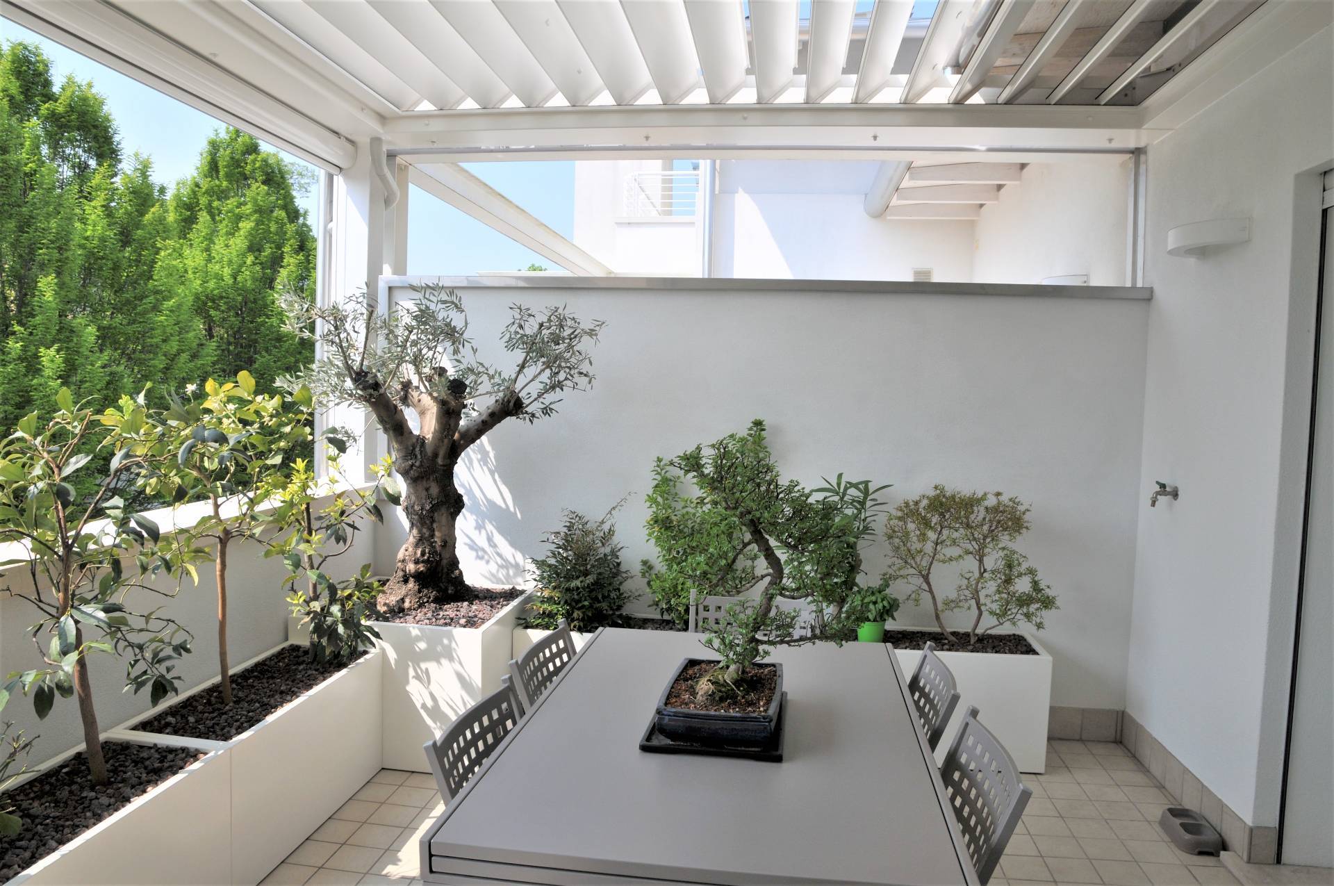Internamente troviamo il soggiorno di 44,00 mq corredato da scala a vista che porta al piano notte, la cucina separata di 17,00 mq, entrambi i vani si affacciano sulla terrazza di 45,00 mq coperta dal sistema di tende biodinamiche; nello stesso piano sono presenti una camera da letto ,un bagno completo di lavanderia ed un secondo terrazzo.