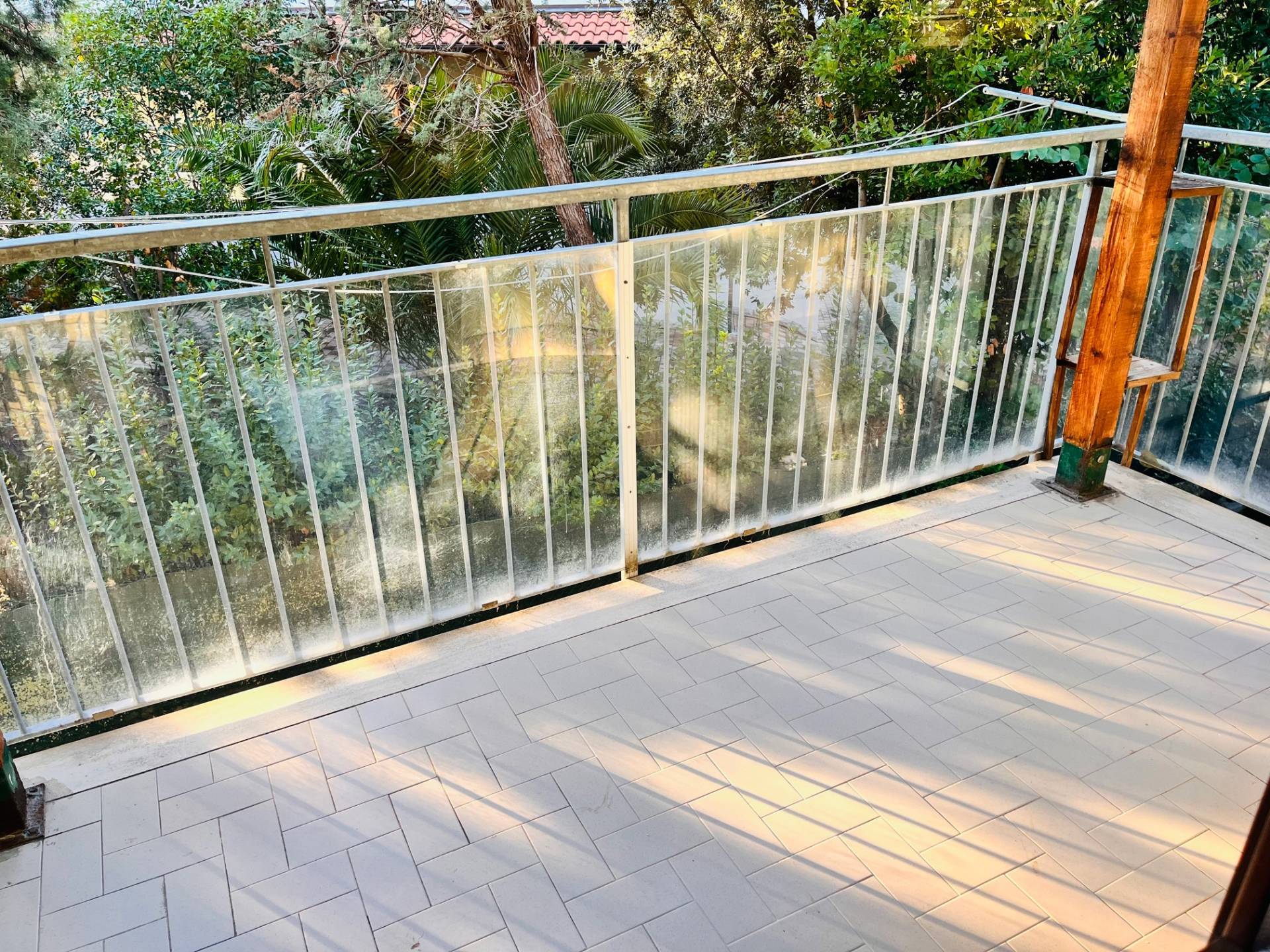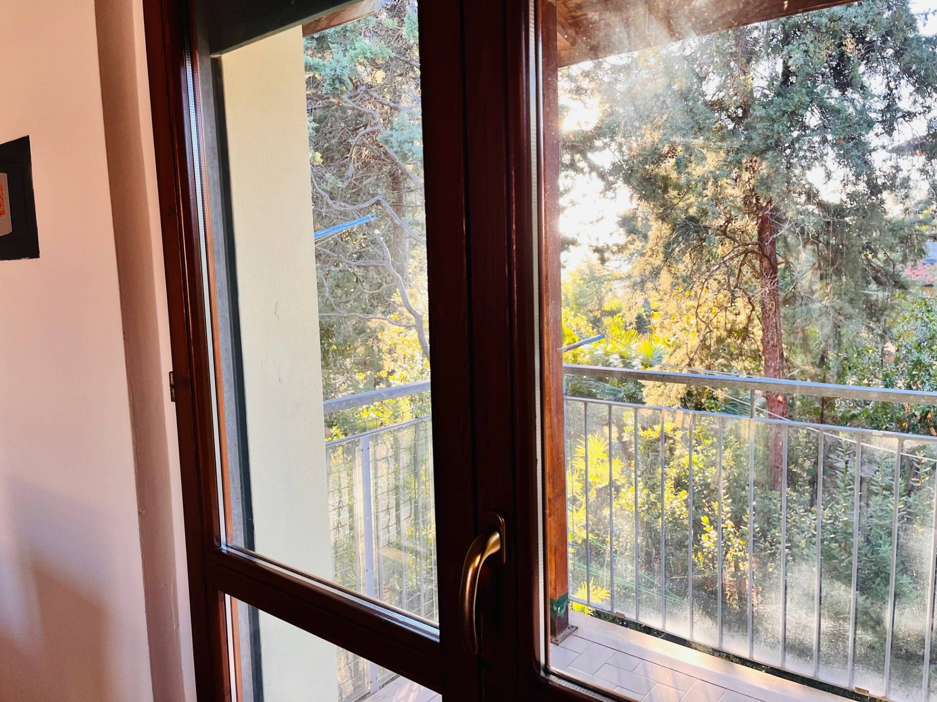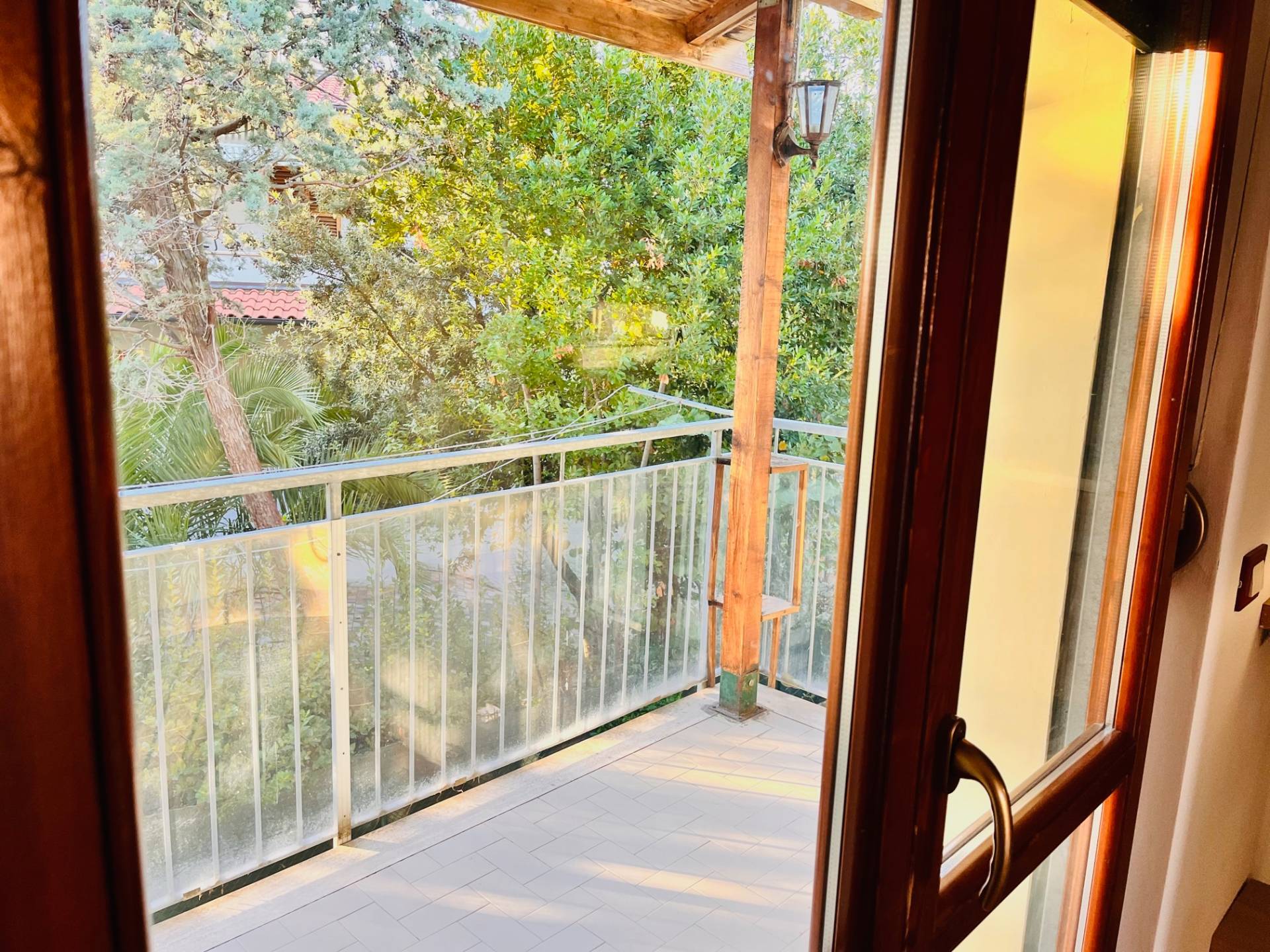 Dal soggiorno si esce verso un balcone con vista sul verde circostante.