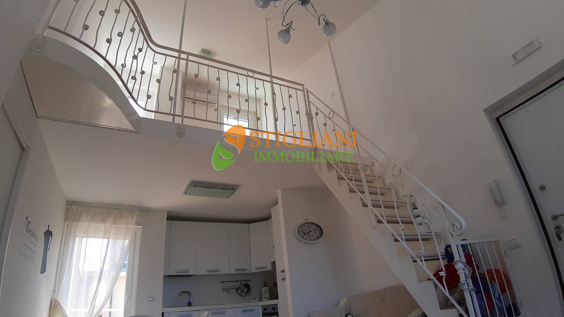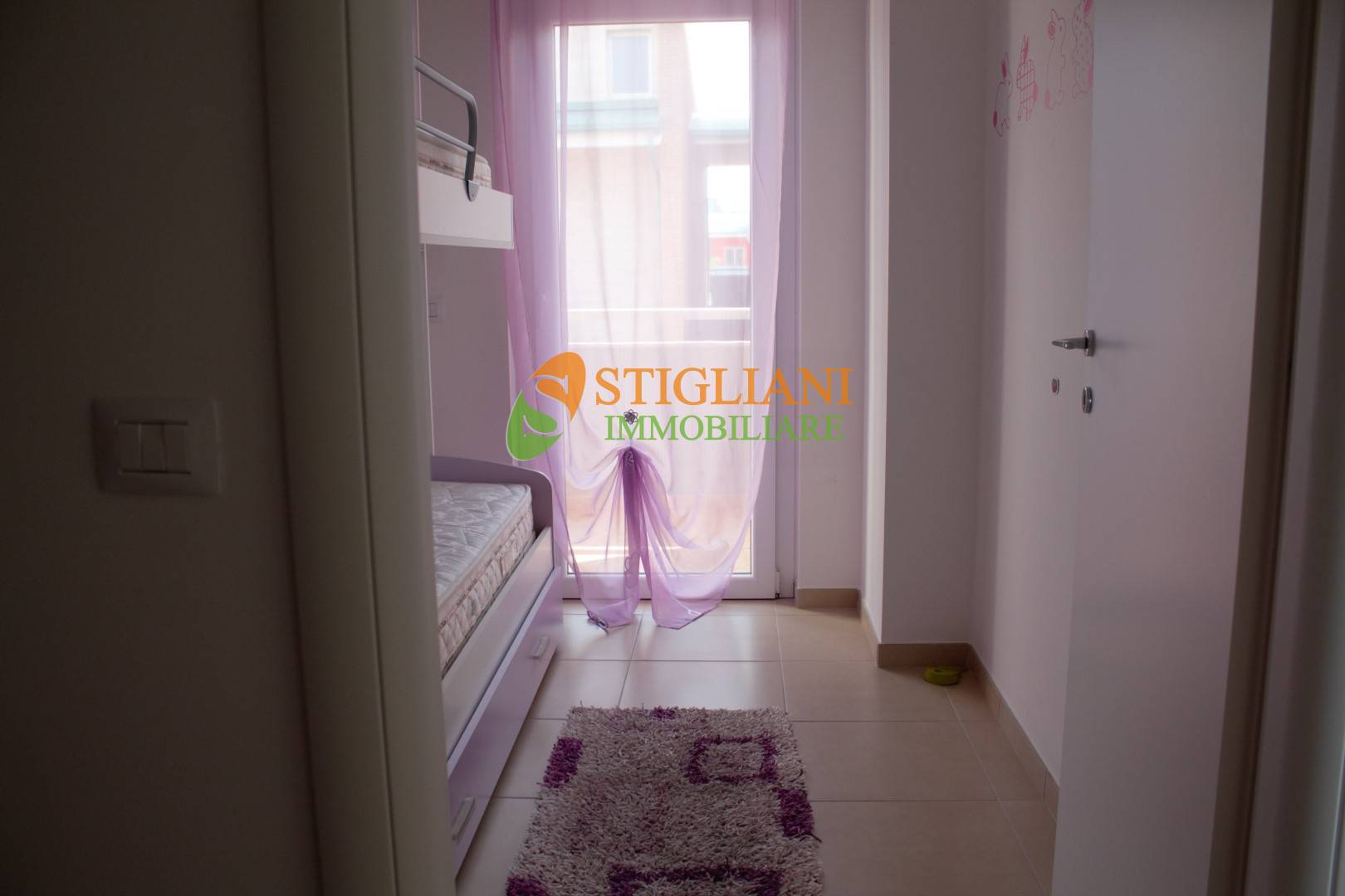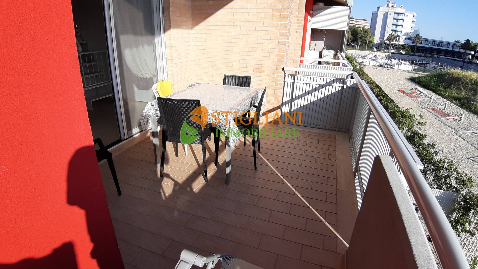 In fabbricato di nuova costruzione sul mare, appartamento arredato al piano primo di metri quadrati 85 commerciali composto da: ingresso, cucina-soggiorno con soppalco adattabile ad altra camera con bagno, due camere, bagno, ampio balcone vista mare con ripostiglio/lavanderia e posto auto esterno.