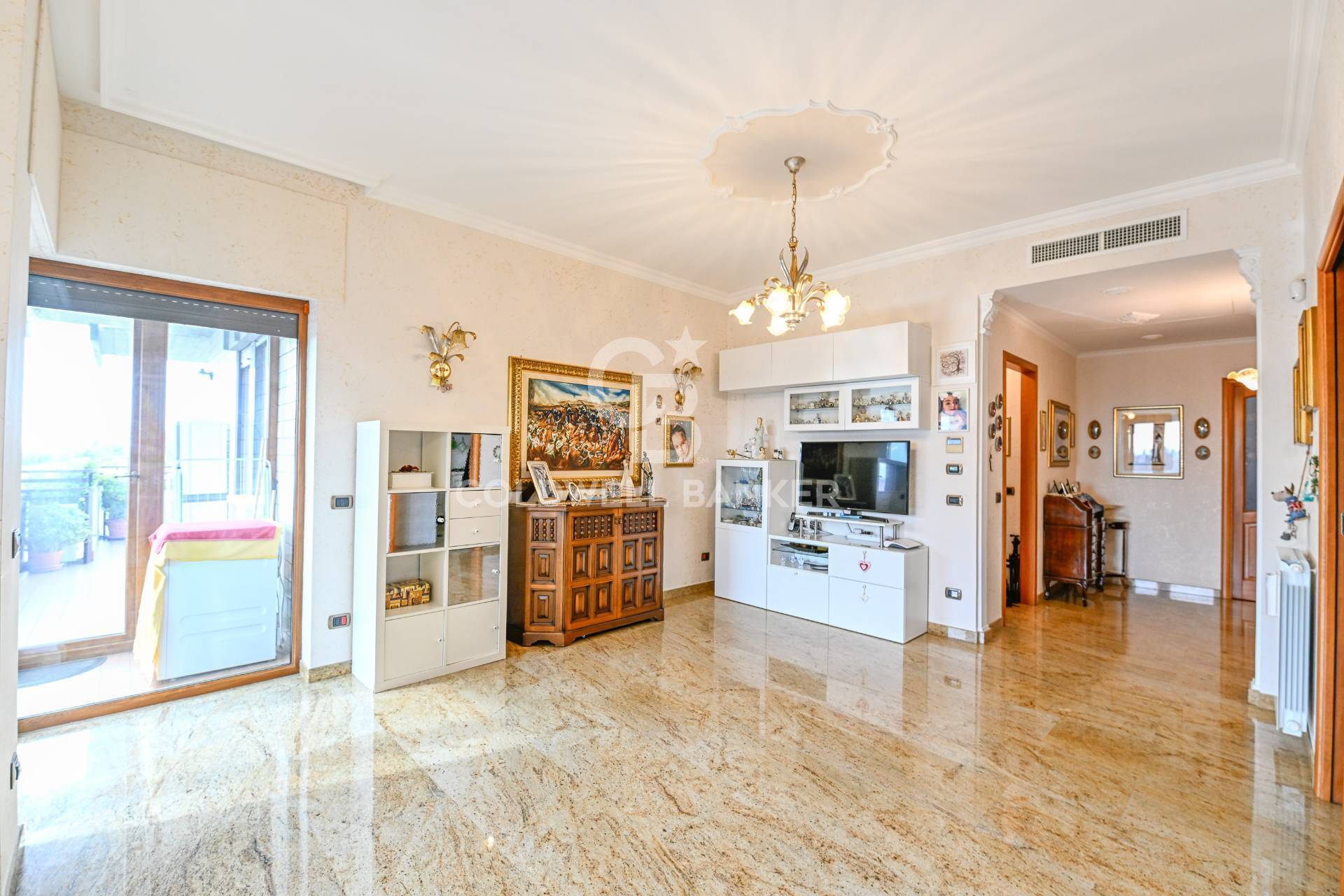 La cucina, il salone e tre delle camere si affacciano direttamente su un balcone verandato e su un terrazzo, garantendo luminosit e continuit tra gli spazi interni ed esterni.