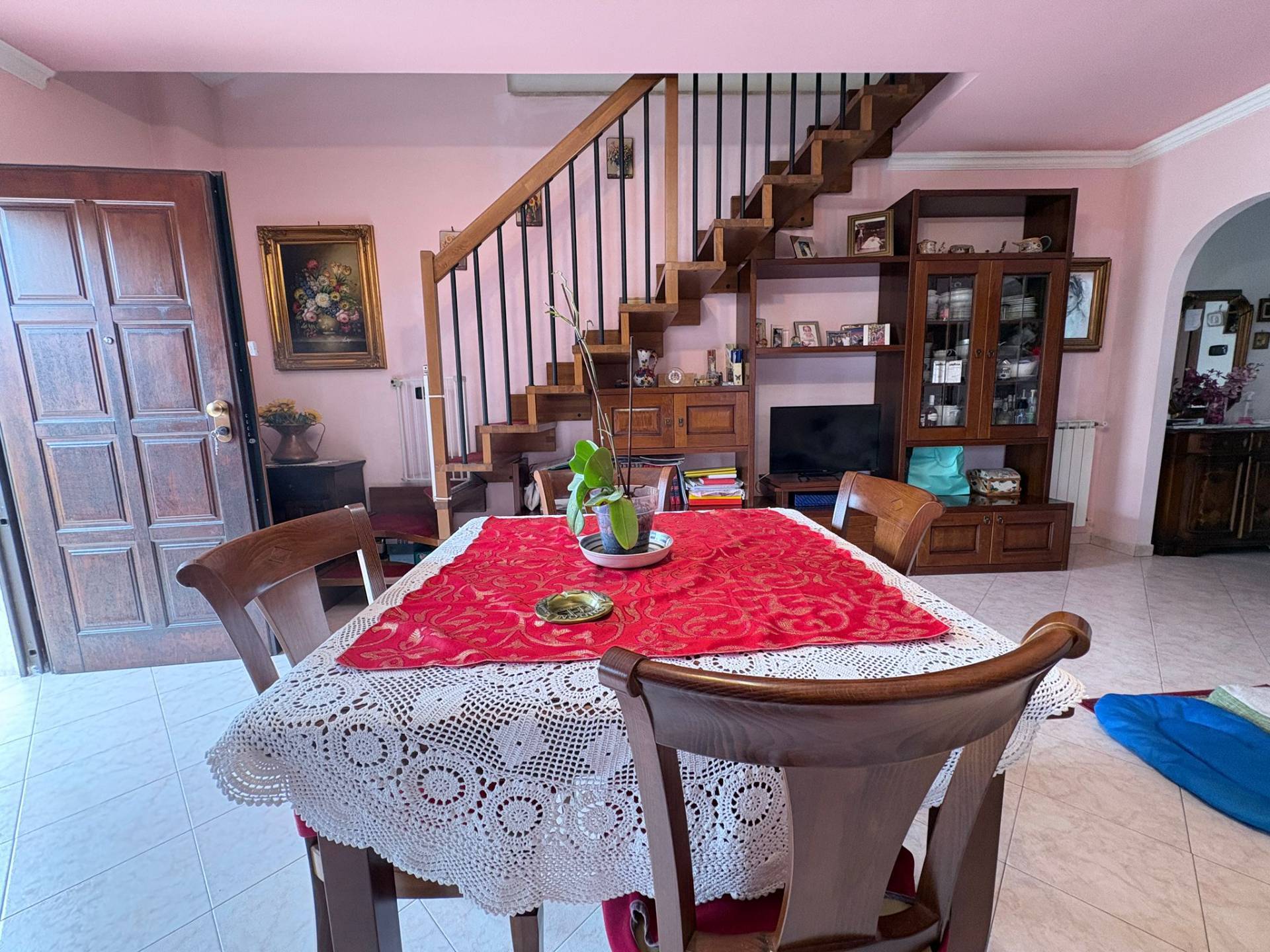 Dal soggiorno, una scala in legno conduce al livello superiore.