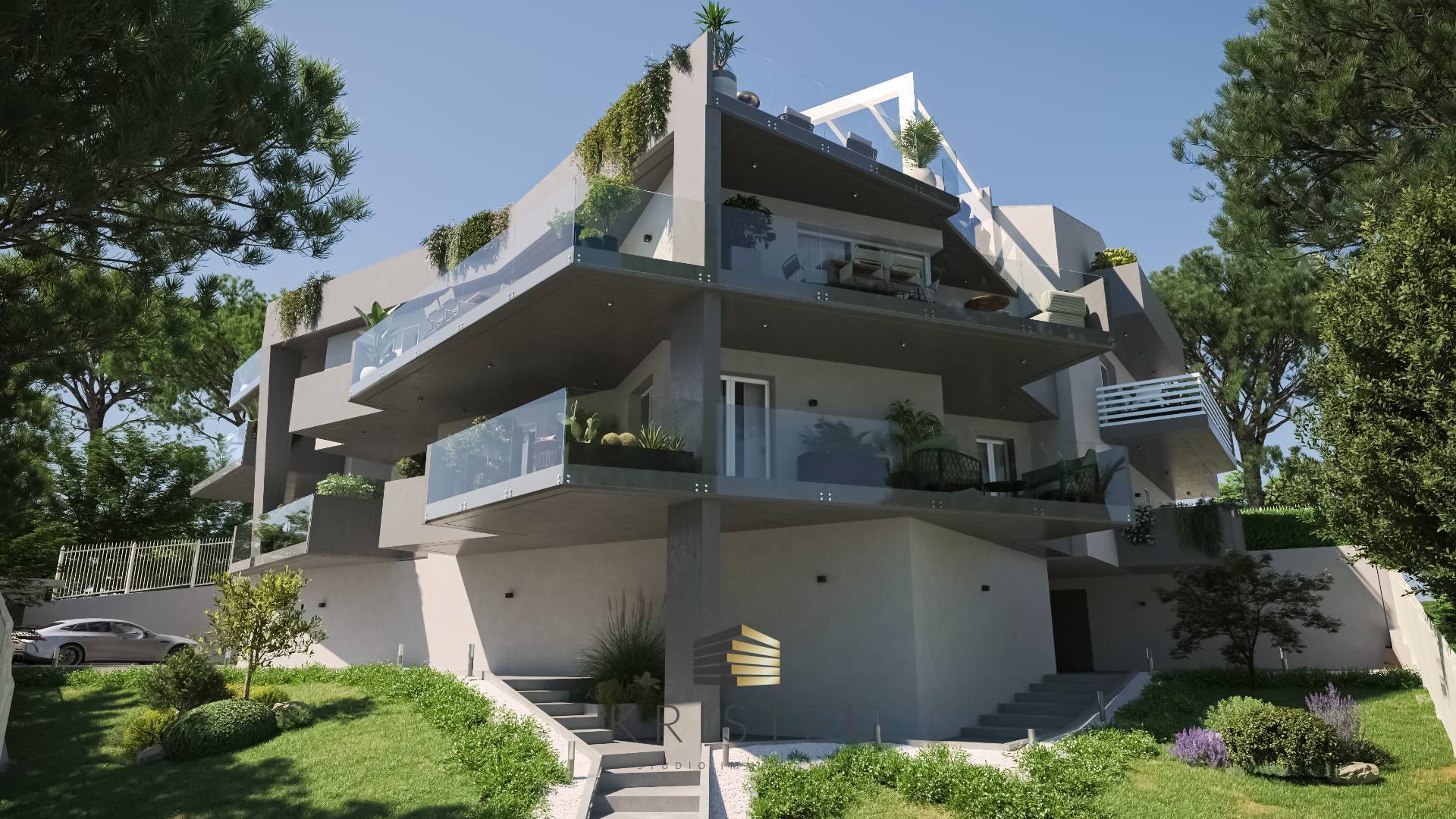 La sua architettura, accattivante e orizzontale, si sviluppa su quattro livelli e si apre al paesaggio con ampi balconi che permettono di creare un contatto visivo e sensoriale con il mare e la natura.
