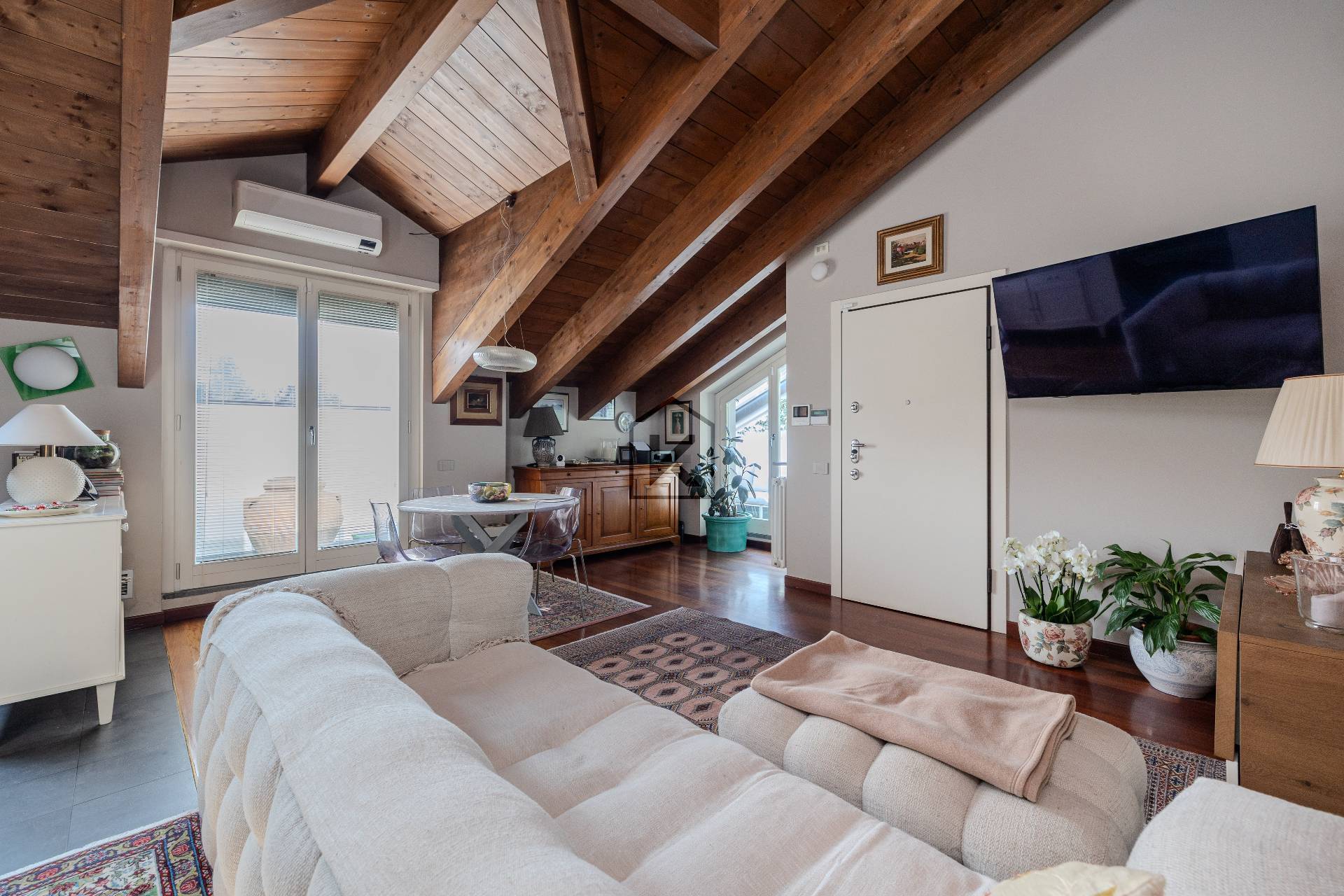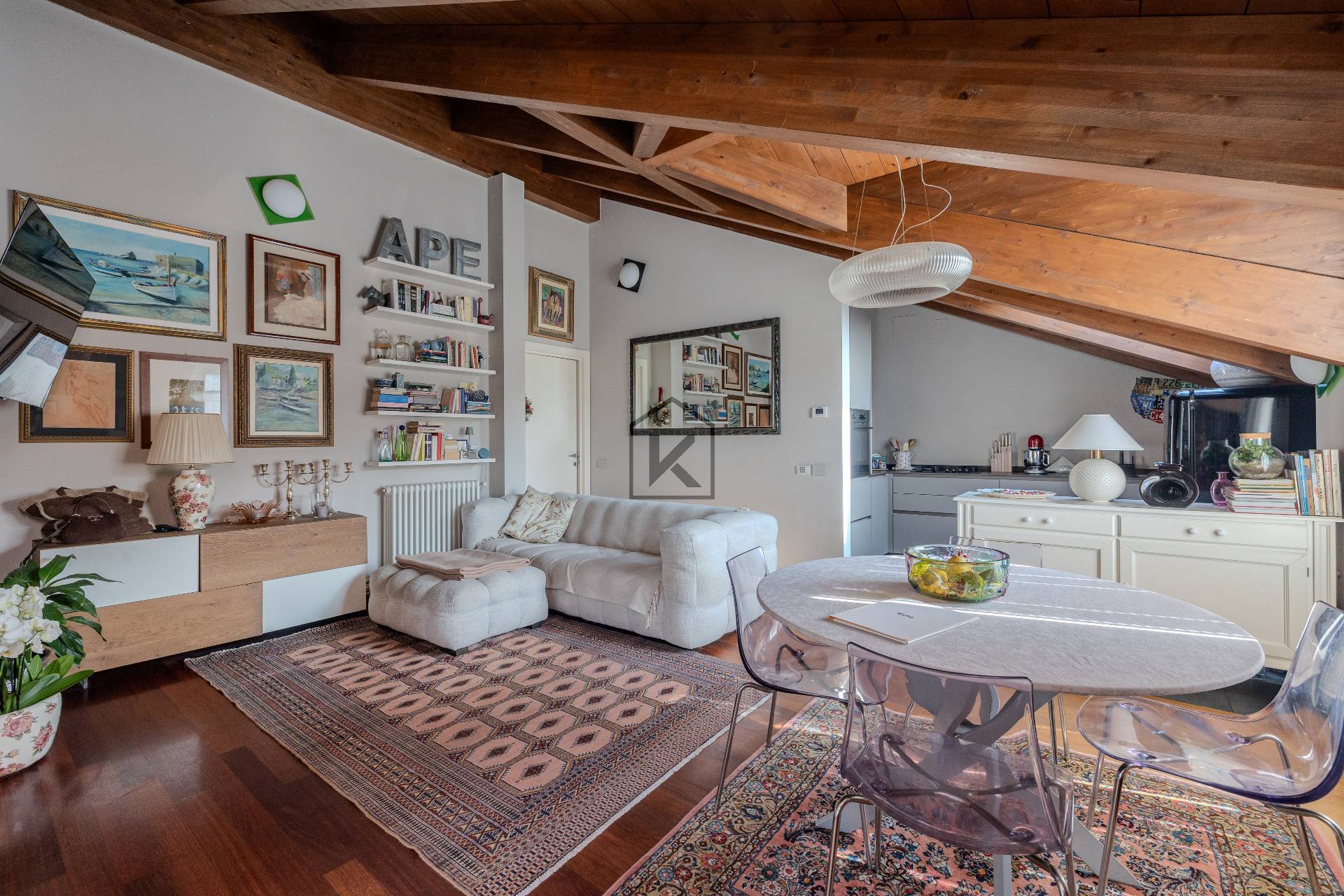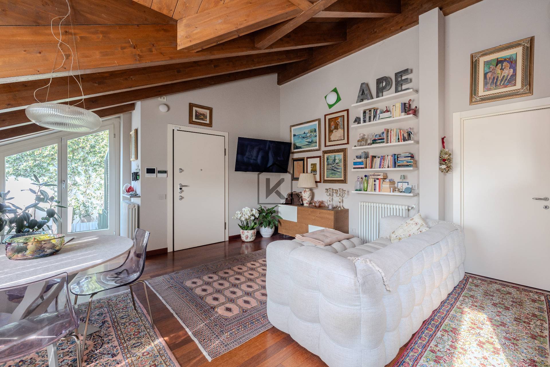 MONZA CENTRO - VENDESI ELEGANTE E LUMINOSA MANSARDA IN OTTIMO STATO CON TERRAZZINO E DUE BALCONI OLTRE BOX. In centro a Monza, nel suggestivo Vicolo Lambretto, Kers Immobiliare propone in vendita elegante e luminosa mansarda in ottimo stato con terrazzino e due balconi oltre box. L'immobile si compone di un ingresso sul soggiorno con cucina a vista e accesso al terrazzino di ca. 7 mq e al balcone, disimpegno, bagno con doccia e porta scorrevole in vetro a scomparsa per ottimizzare gli spazi e valorizzare lestetica contemporanea ed elegante dellimmobile, una grande camera da letto con balcone e comoda cabina armadio; completano la propriet il box di ca. 20 mq (profondit ca. 6.15 m, larghezza ca. 2.90 m) e la cantina.