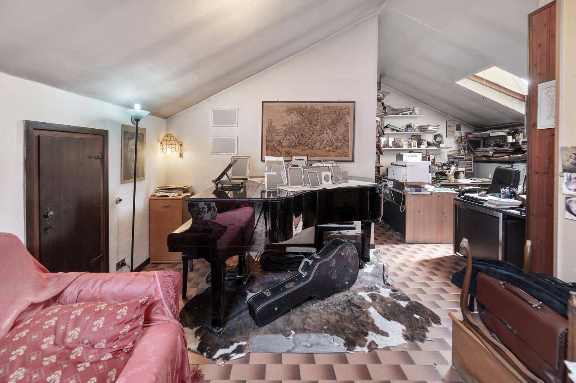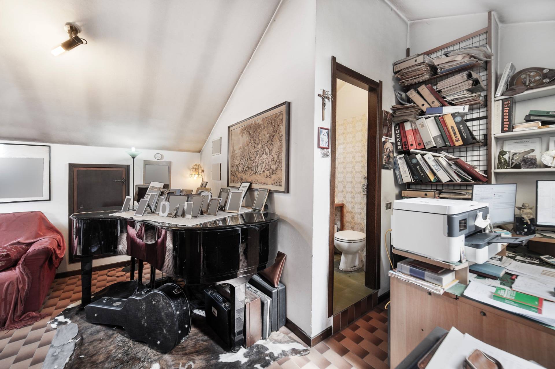 Al piano superiore, raggiungibile sia dalle scale comuni che da unelegante scala a chiocciola interna, c la zona mansarda, 72 mq (altezza interna 3,20 metri al colmo e 1,80 metri alla gronda), locale hobby/studio/sala musica, con proprio bagno e con la presenza di un caminetto a legna e di due ripostigli sotto tetto.