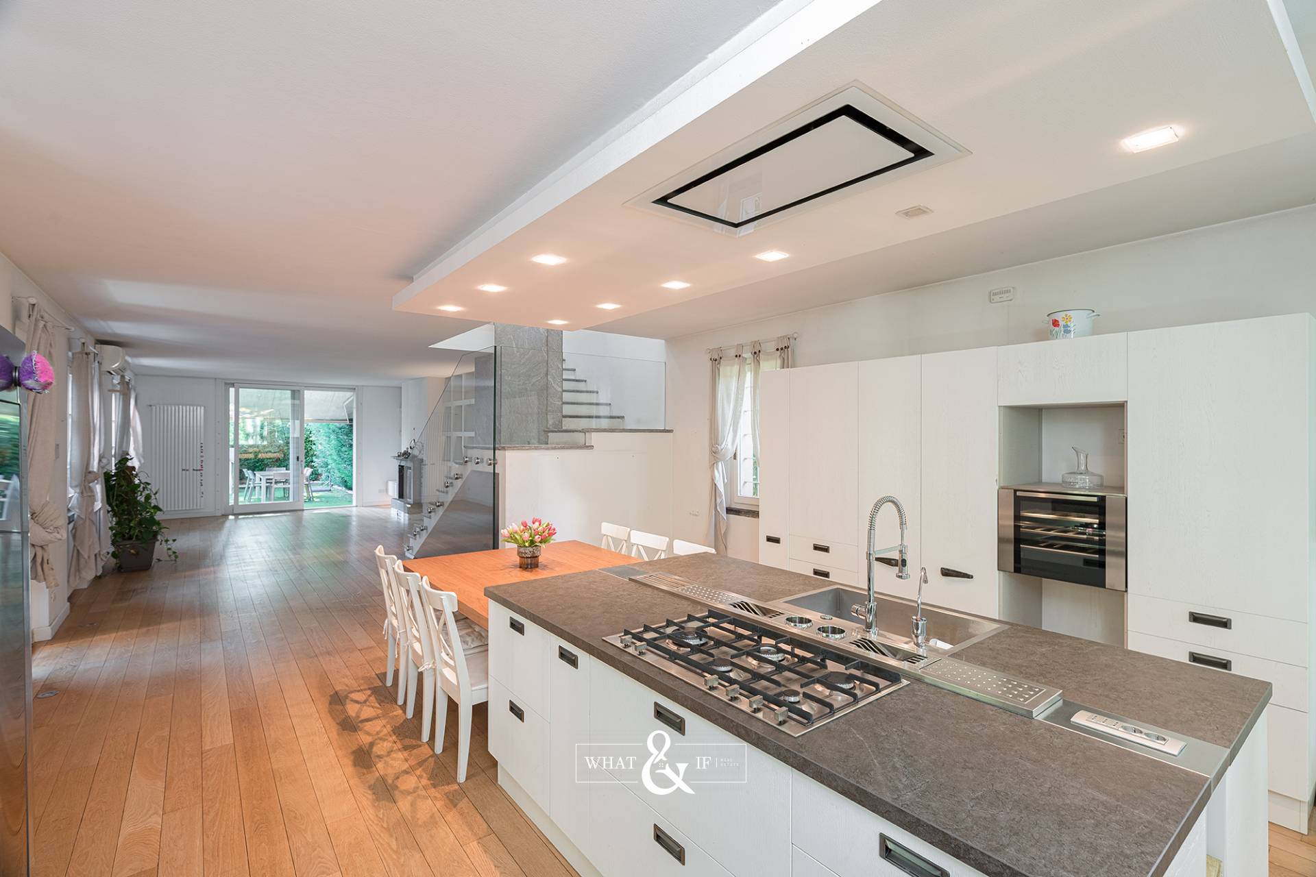 Una spaziosa veranda, in continuit con la cucina, conduce alla porzione del giardino sul retro.