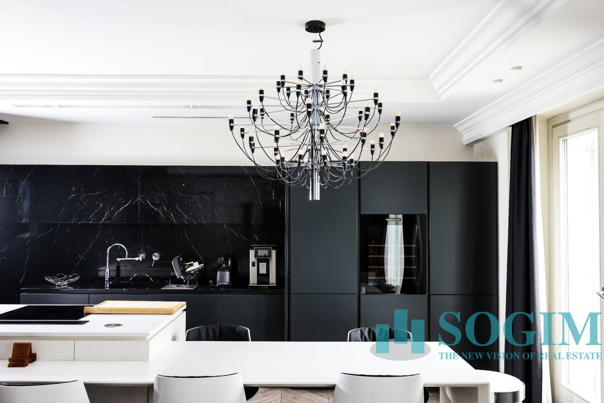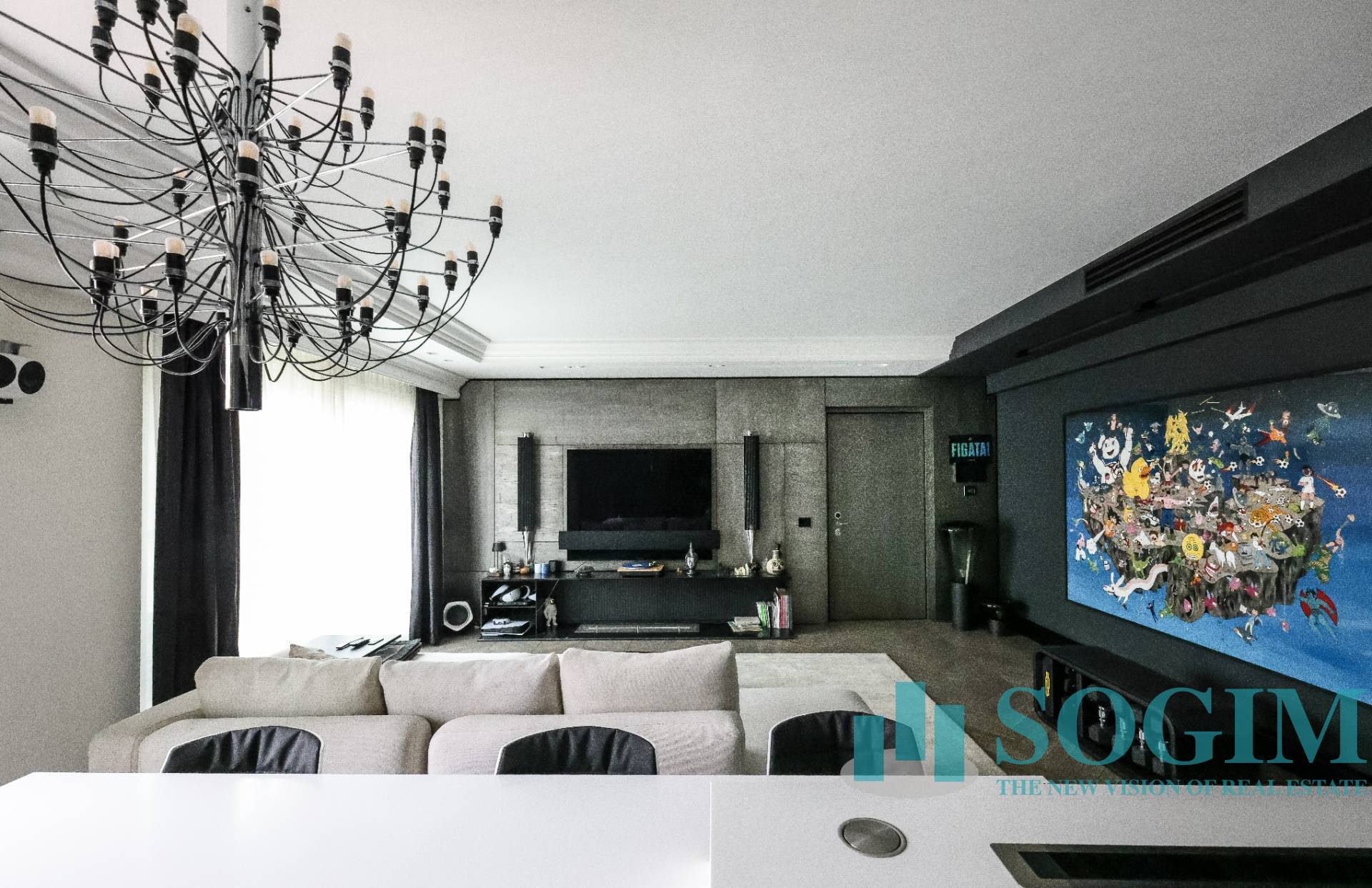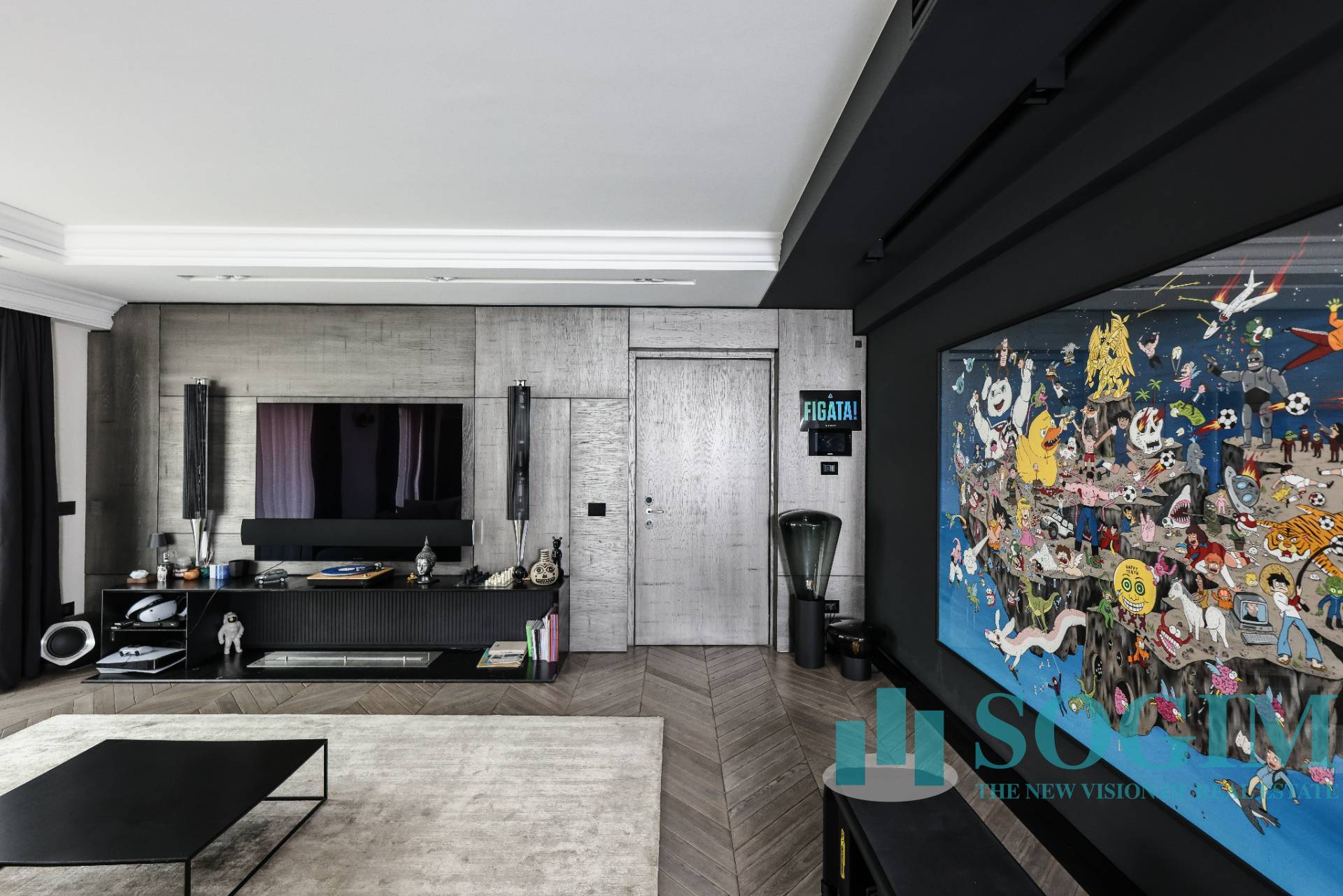 Parlando dei rivestimenti, l'appartamento stato completato con esclusive finiture come parquet a lisca di pesce e marmo di Carrara bianco e nero nei bagni, dove troviamo spazioso piatto doccia e sanitari sospesi Antonio Lupi. La soluzione interamente illuminata da un ricercato impianto con lampadari Flos, camera da letto con arredi di design Poliform come anche la seconda camera attualmente utilizzata come cabina armadio.