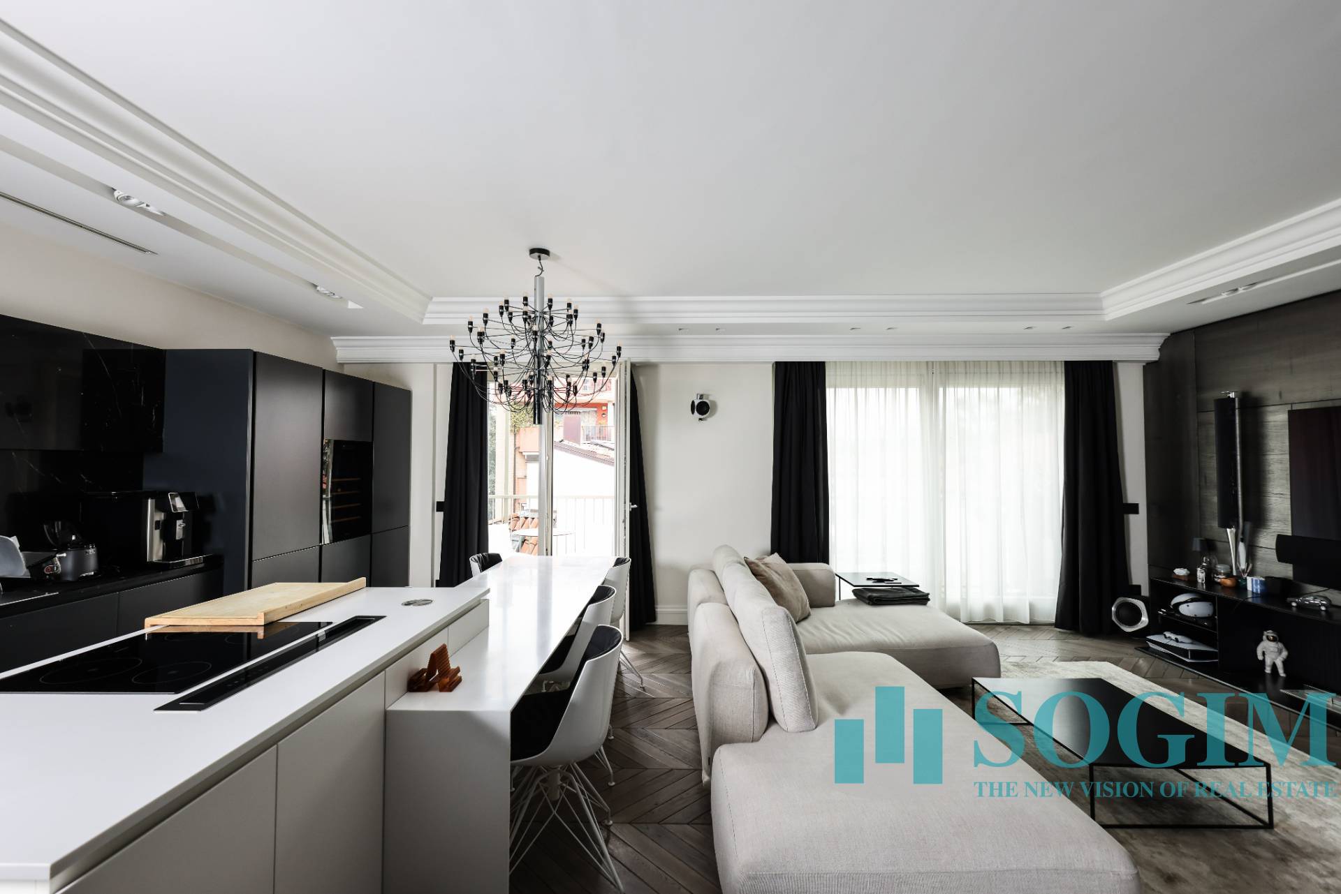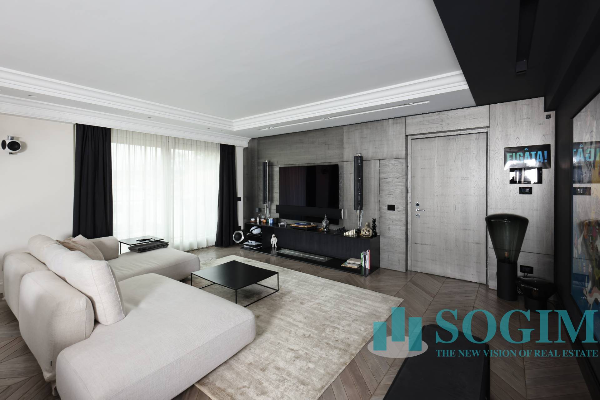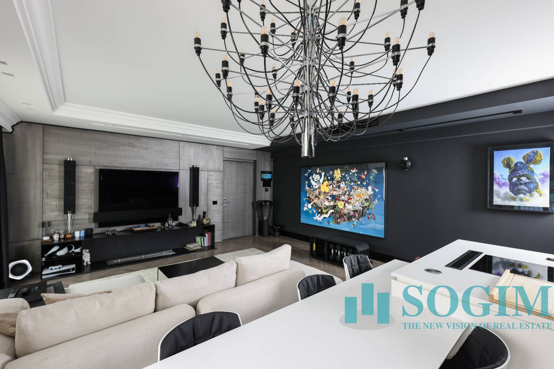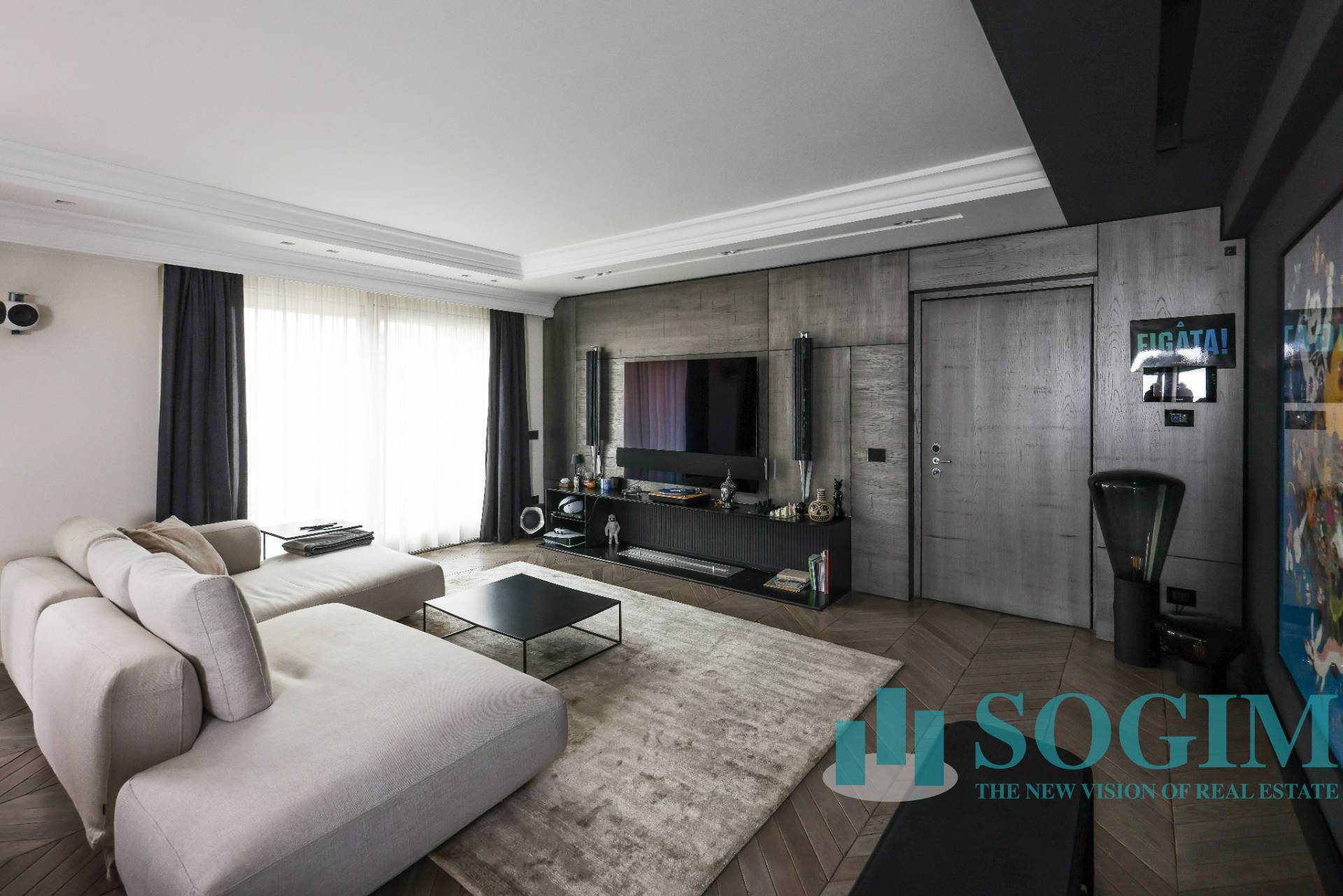Parlando dei rivestimenti, l'appartamento stato completato con esclusive finiture come parquet a lisca di pesce e marmo di Carrara bianco e nero nei bagni, dove troviamo spazioso piatto doccia e sanitari sospesi Antonio Lupi. La soluzione interamente illuminata da un ricercato impianto con lampadari Flos, camera da letto con arredi di design Poliform come anche la seconda camera attualmente utilizzata come cabina armadio.