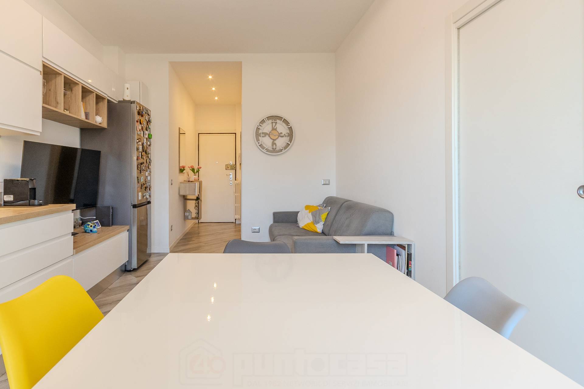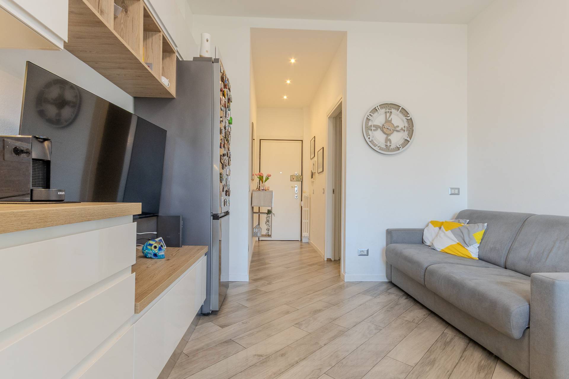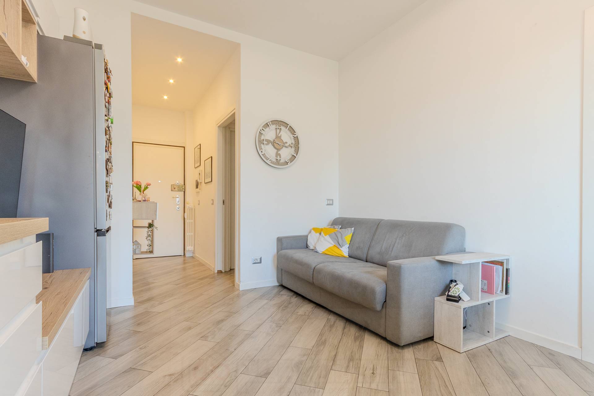 Lappartamento si apre su un comodo ingresso che accompagna allampio soggiorno con cucina a vista, un ambiente moderno e ben distribuito, impreziosito da un arredo funzionale e armoniosamente coordinato.