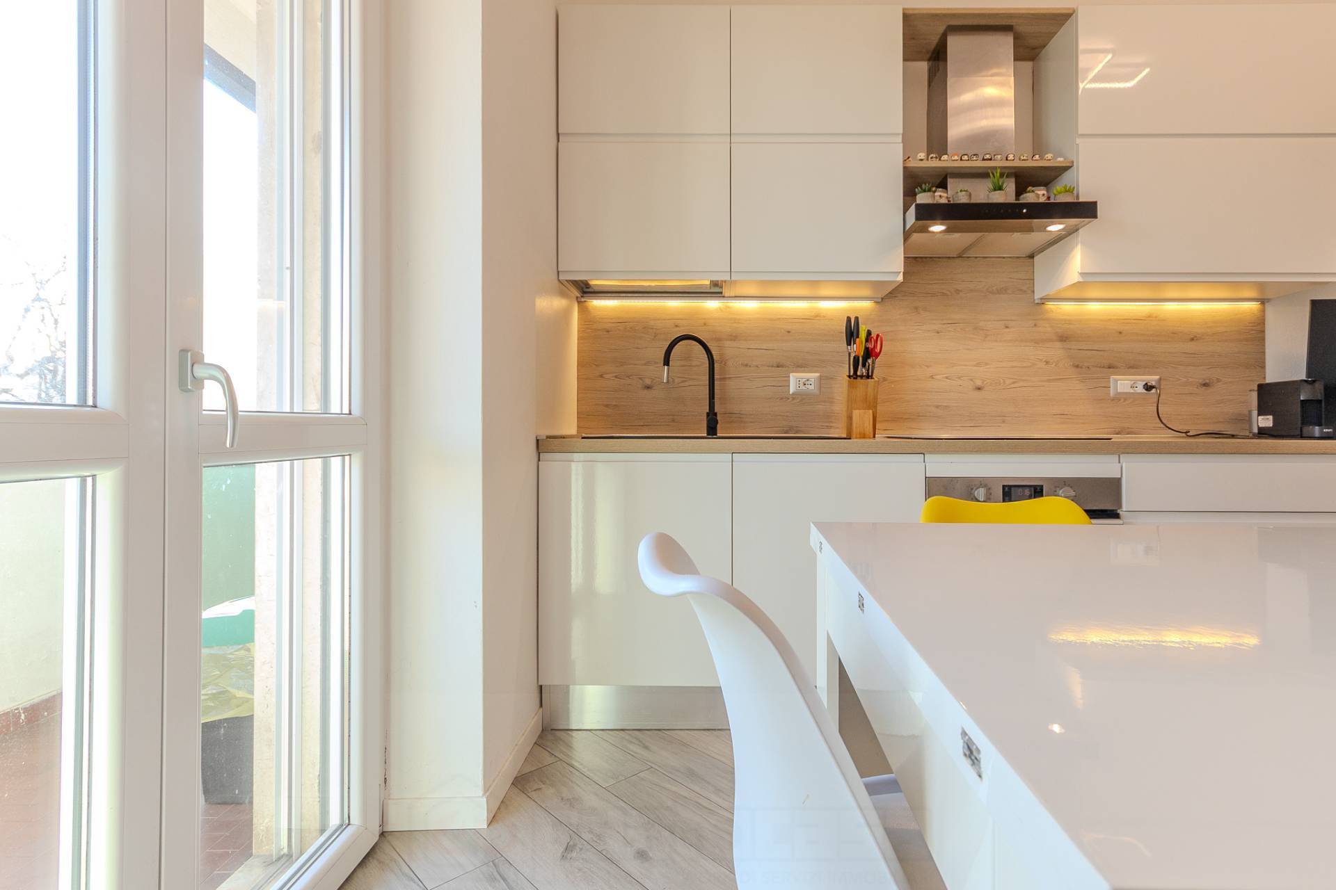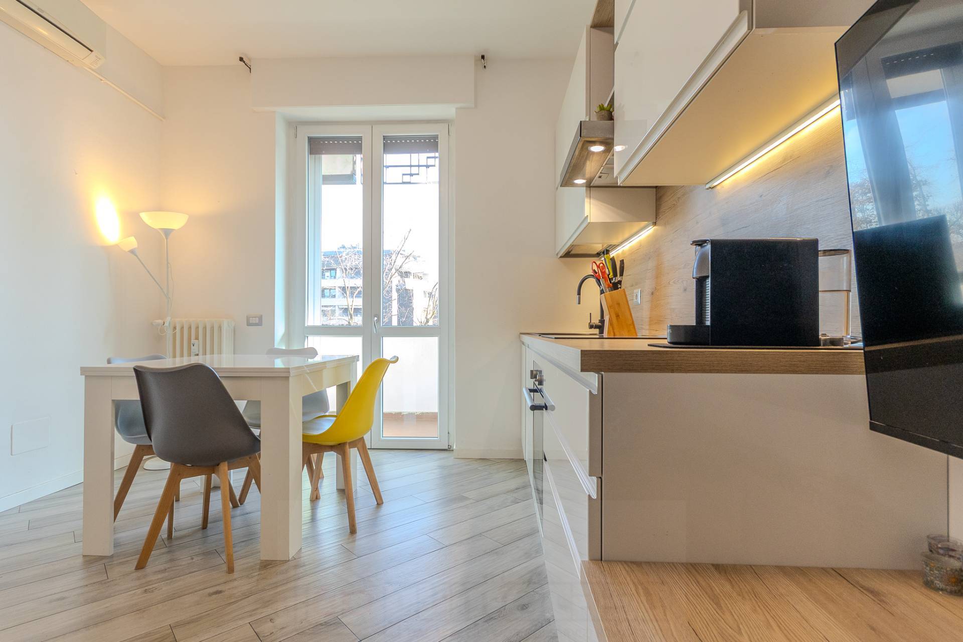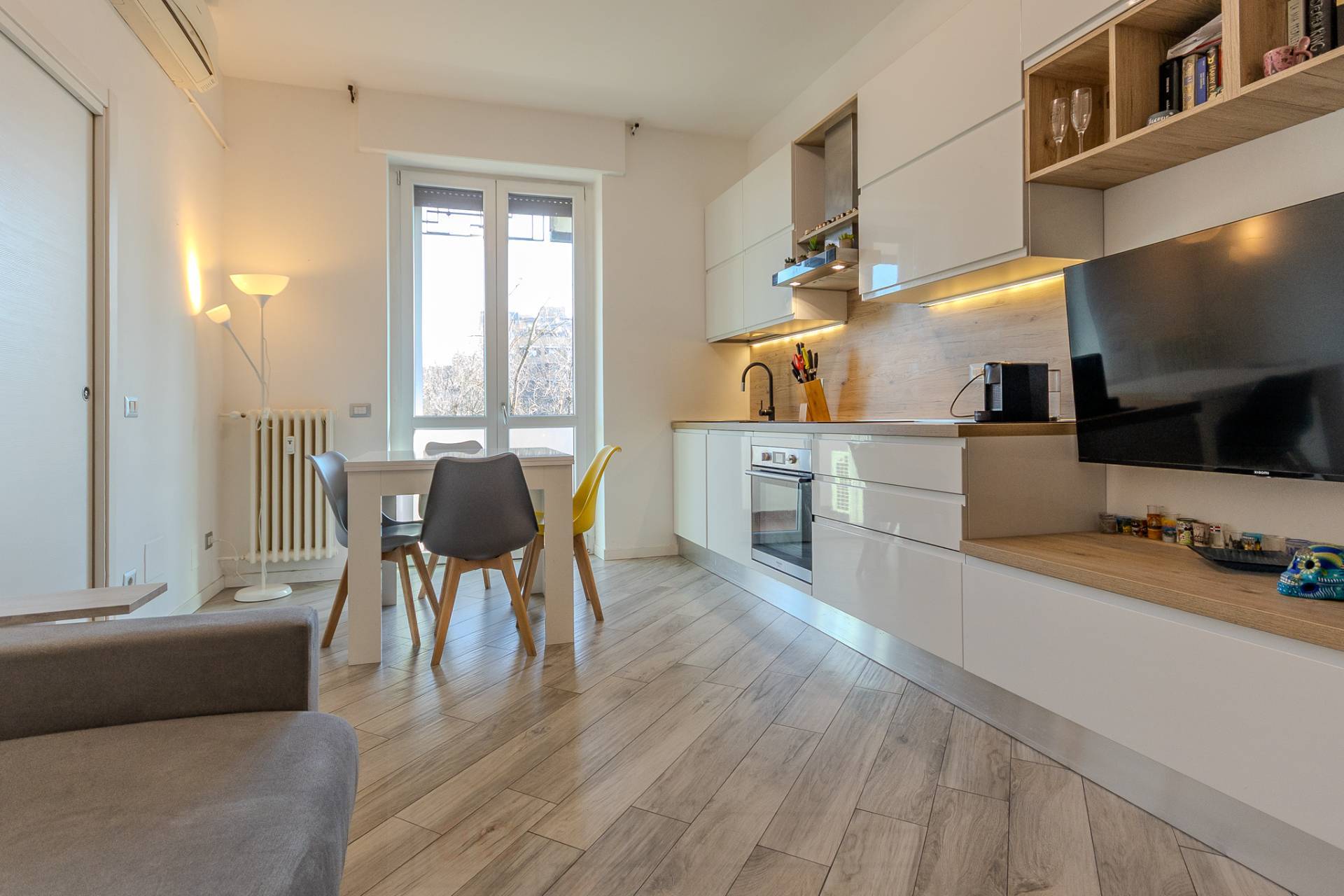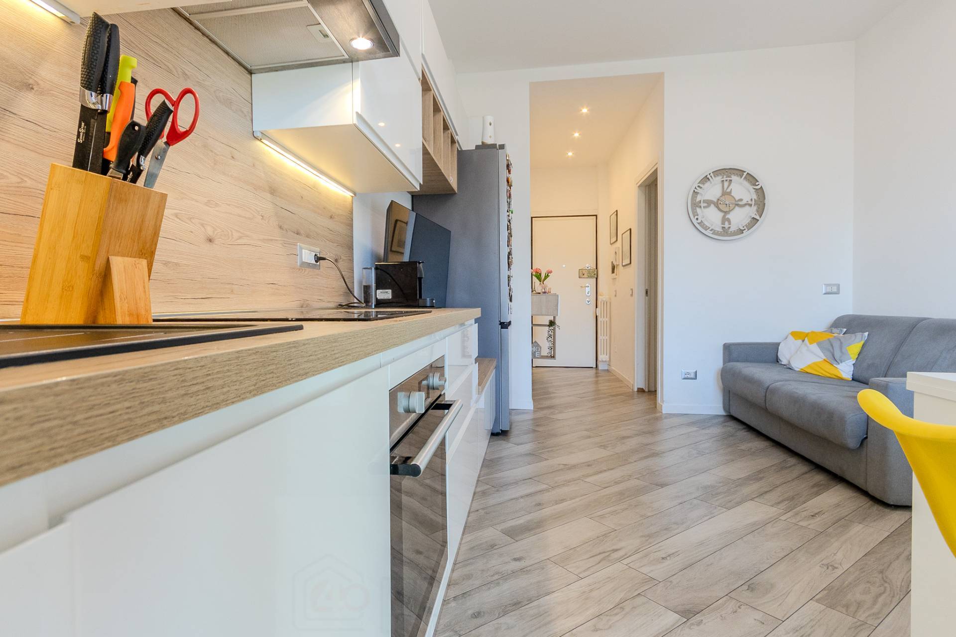 Lappartamento si apre su un comodo ingresso che accompagna allampio soggiorno con cucina a vista, un ambiente moderno e ben distribuito, impreziosito da un arredo funzionale e armoniosamente coordinato.