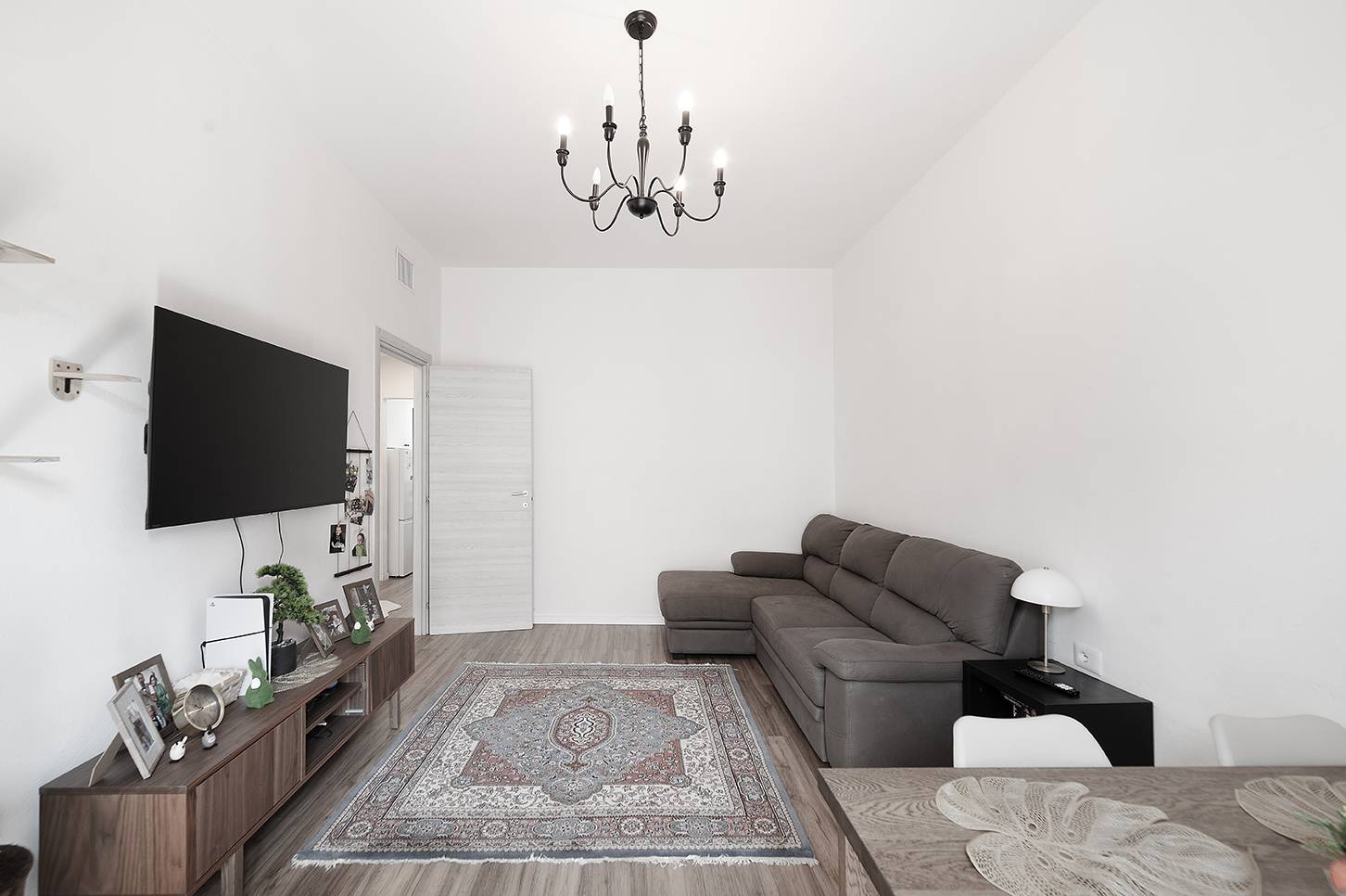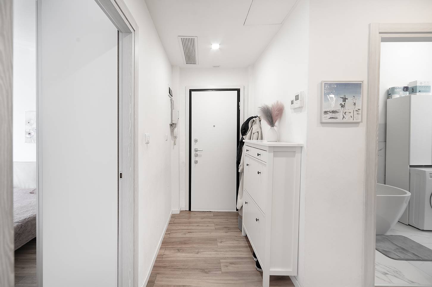 Lingresso conduce a un ampio e accogliente soggiorno con accesso diretto al balcone, perfetto per momenti di relax.
