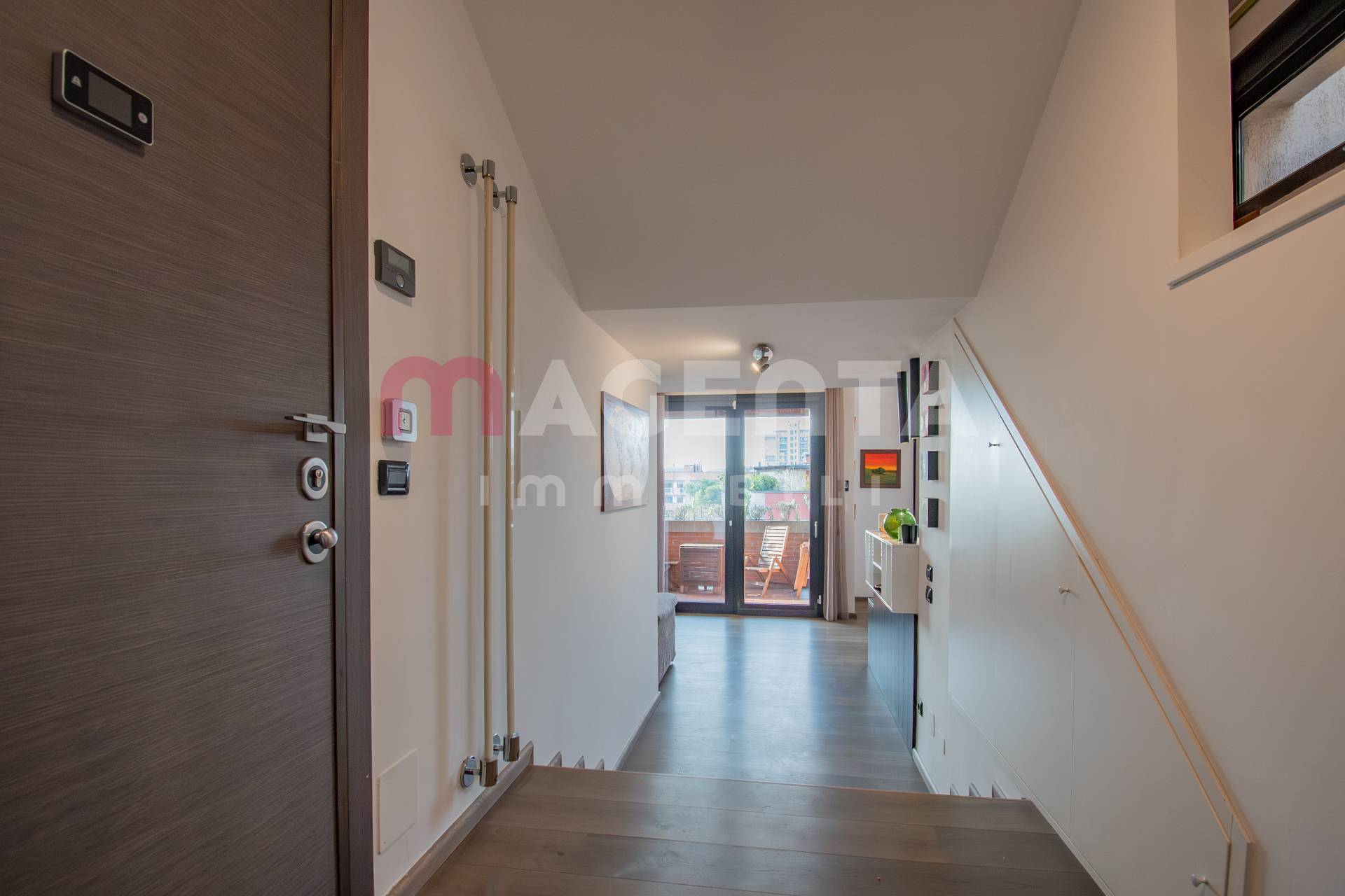 Si accede direttamente tramite disimpegno da cui a sinistra, scendendo un paio di scalini si viene accolti da uno spazio openspace luminoso e conviviale, con zona soggiorno e cucina ad isola con angolo sala da pranzo.