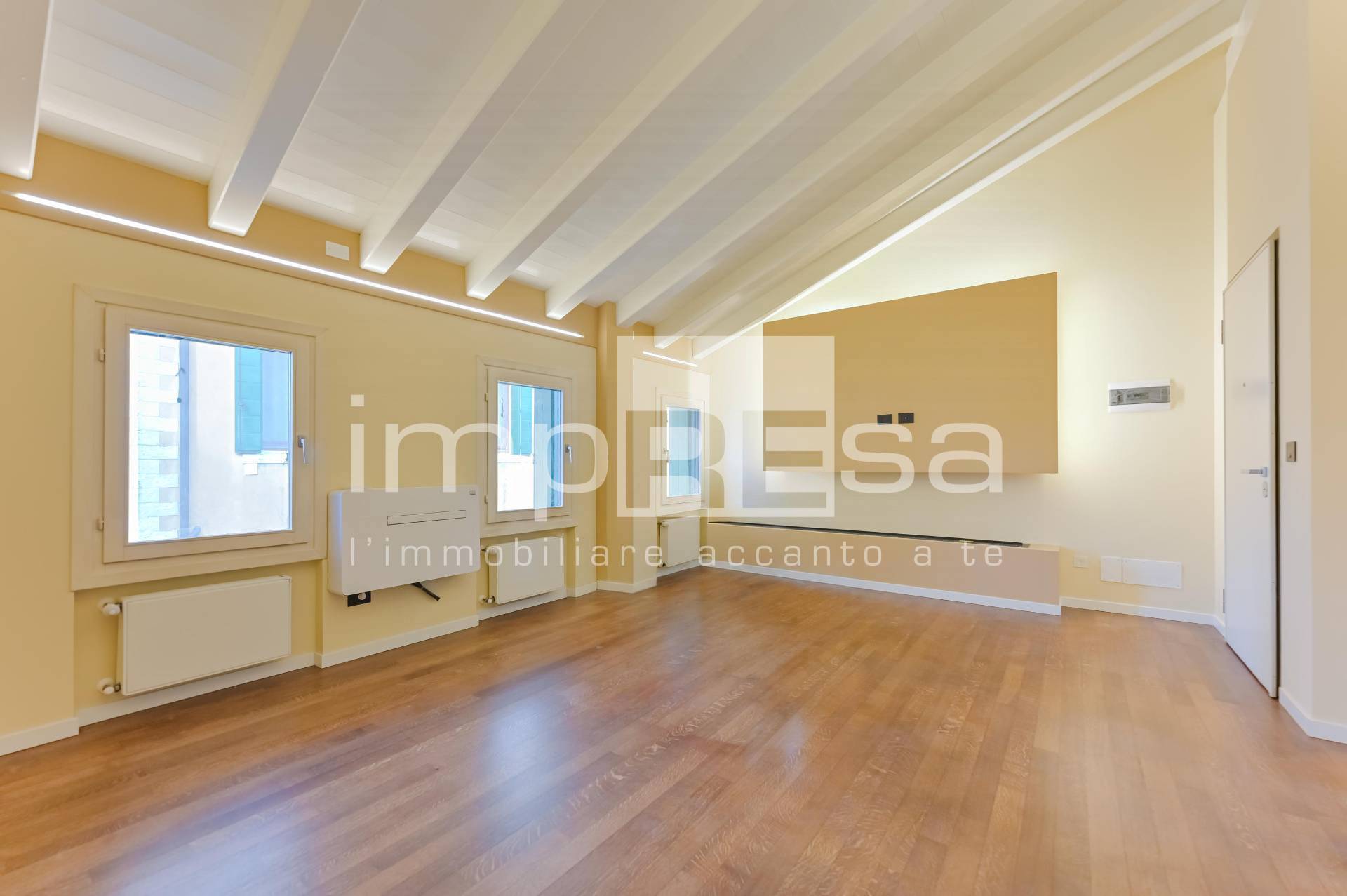 La recente ristrutturazione comprende le finiture interne, con realizzazione di illuminazione LED integrata in velette di cartongesso; pavimento in legno completamente restaurato e riverniciato, con sostituzione di battiscopa e travi in legno trattate con pittura bianca e cera protettiva; rasatura completa delle pareti per uniformare le superfici, seguita da tre mani di smalto murale lavabile San Marco ad alta resistenza.