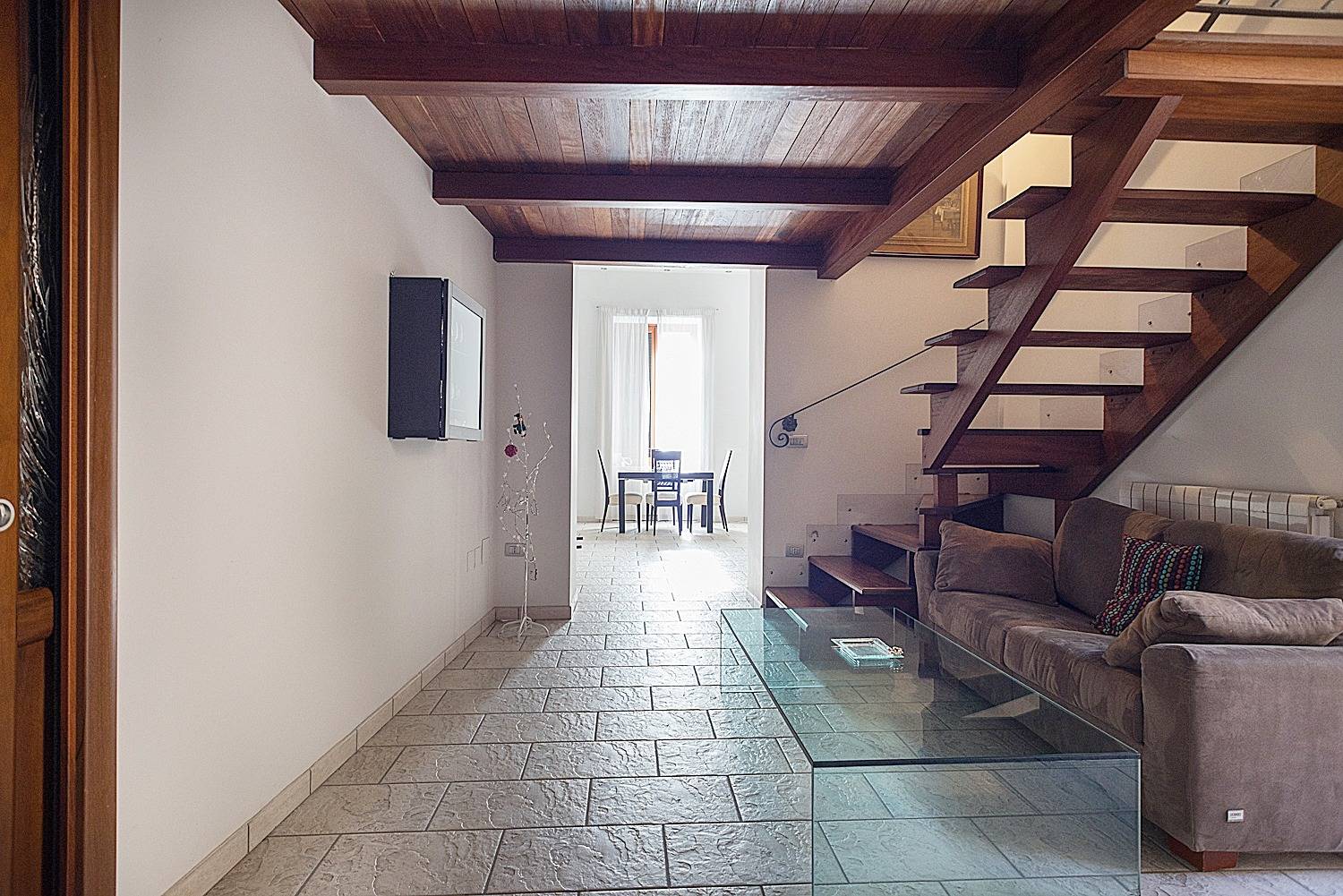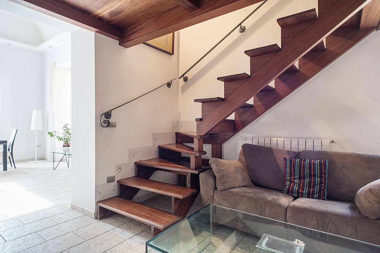Lappartamento ti accoglie con un salone ampio, dotato di esposizione con balcone, collegato a un soggiorno con travi a vista e scala in legno e ferro battuto che porta alla zona notte.