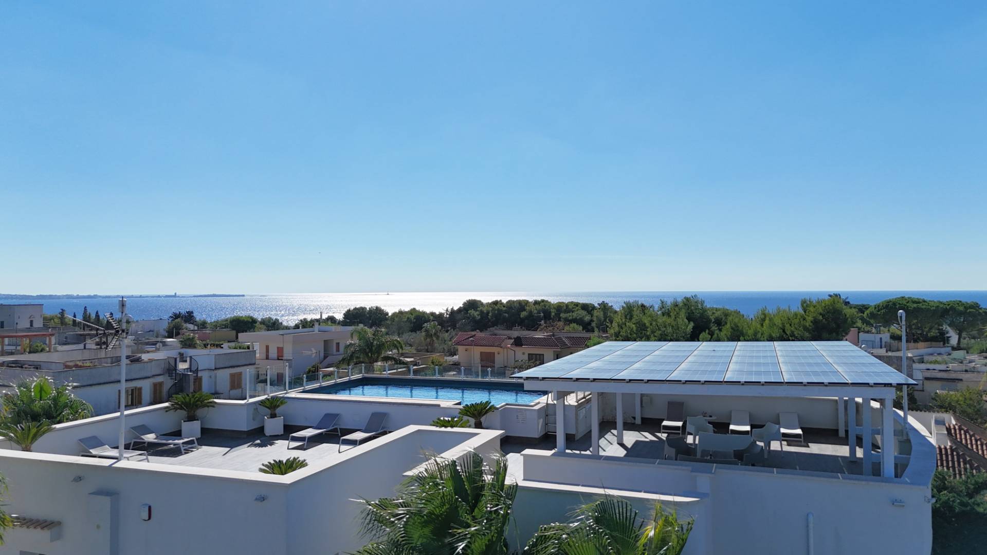 Il vero cuore del residence la splendida terrazza vista mare, dove una piscina riscaldata si fonde con il panorama del Mar Ionio.