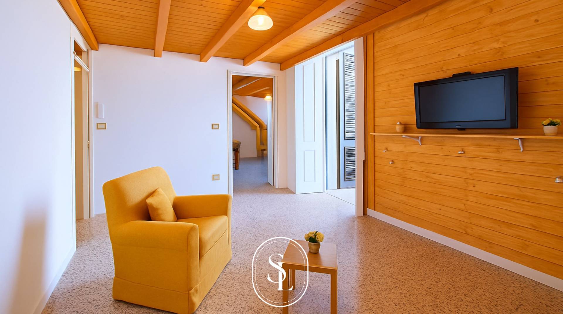I suoi 140 mq si sviluppano come un percorso sensoriale: lingresso accoglie lo sguardo e lo accompagna lungo il corridoio, guidato dalla luce del mare che sembra entrare in casa, fino alla prima camera da letto con bagno en suite e soppalco.