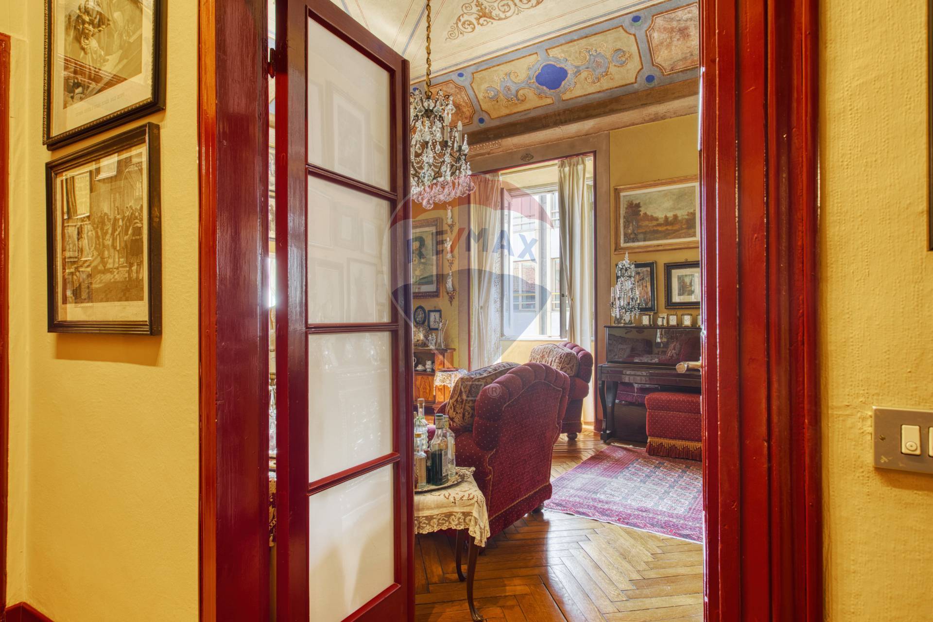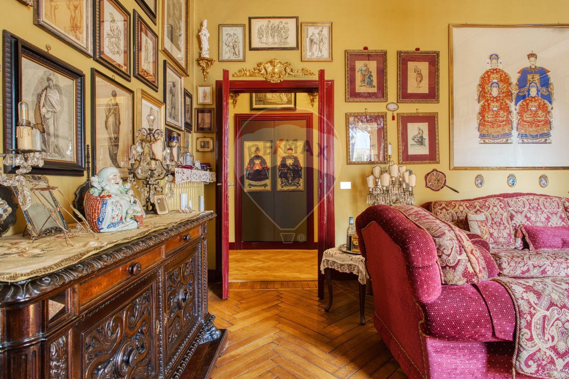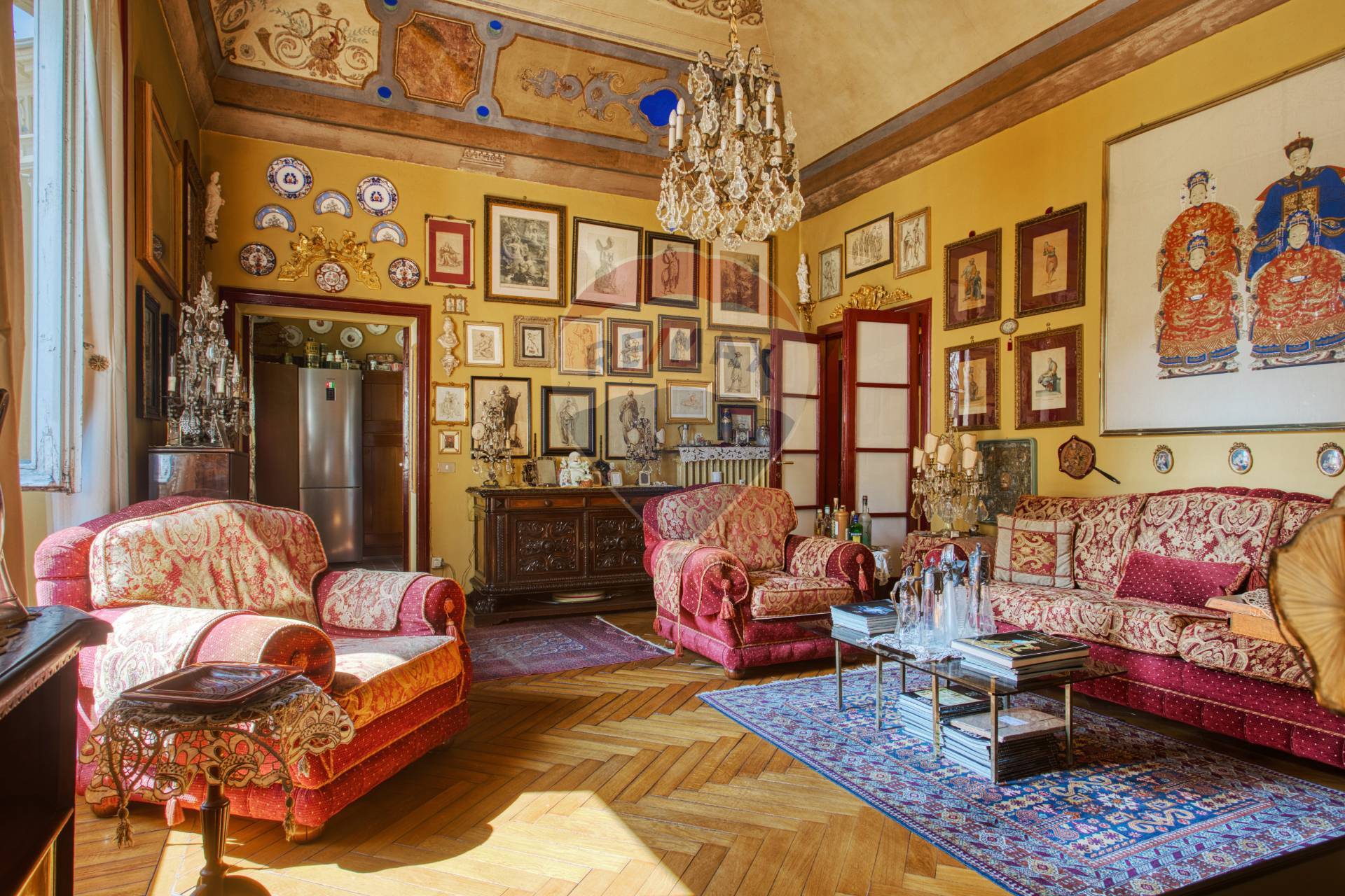 Entrando al piano nobile troviamo il corridoio dingresso, pavimentato in parquet a spina di pesce e arredato come una galleria darte, che distribuisce a tutti gli ambienti della zona giorno: il grande salone affacciato su Corso Cavour, ideale come soggiorno di rappresentanza o ampia sala da pranzo; una calda ed accogliente cucina abitabile rivestita in ceramiche blu e gialle con finestra panoramica; un intimo soggiorno/biblioteca con librerie su misura e uno studio con balcone sulla via principale, facilmente trasformabile in seconda camera matrimoniale.