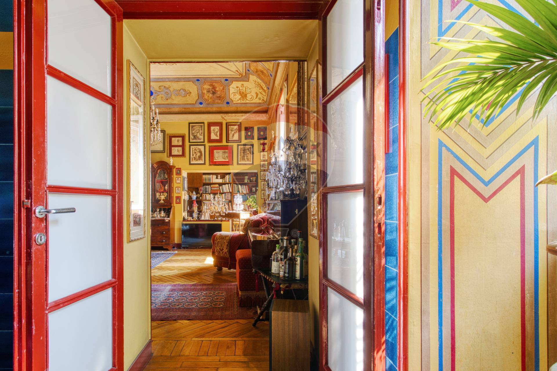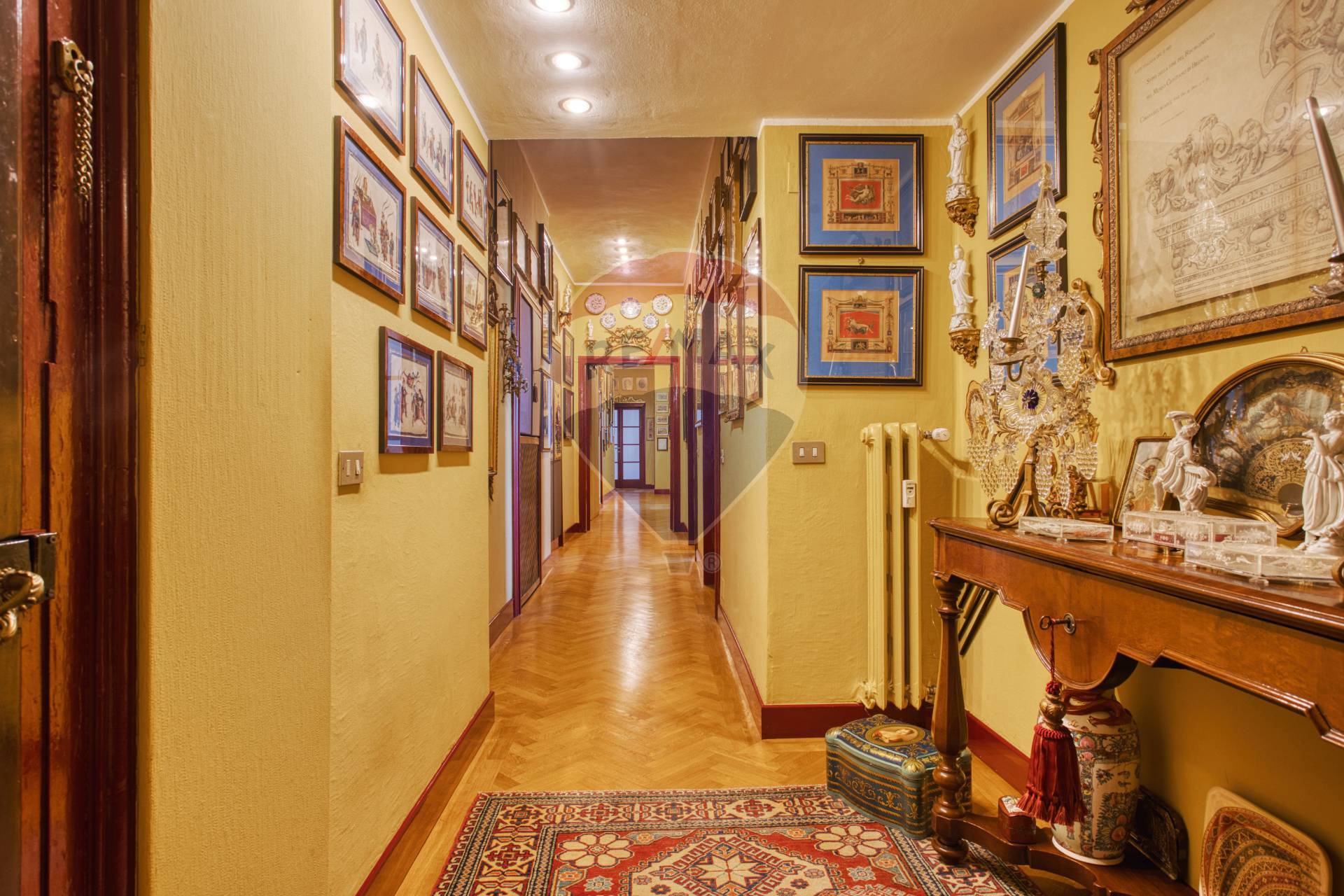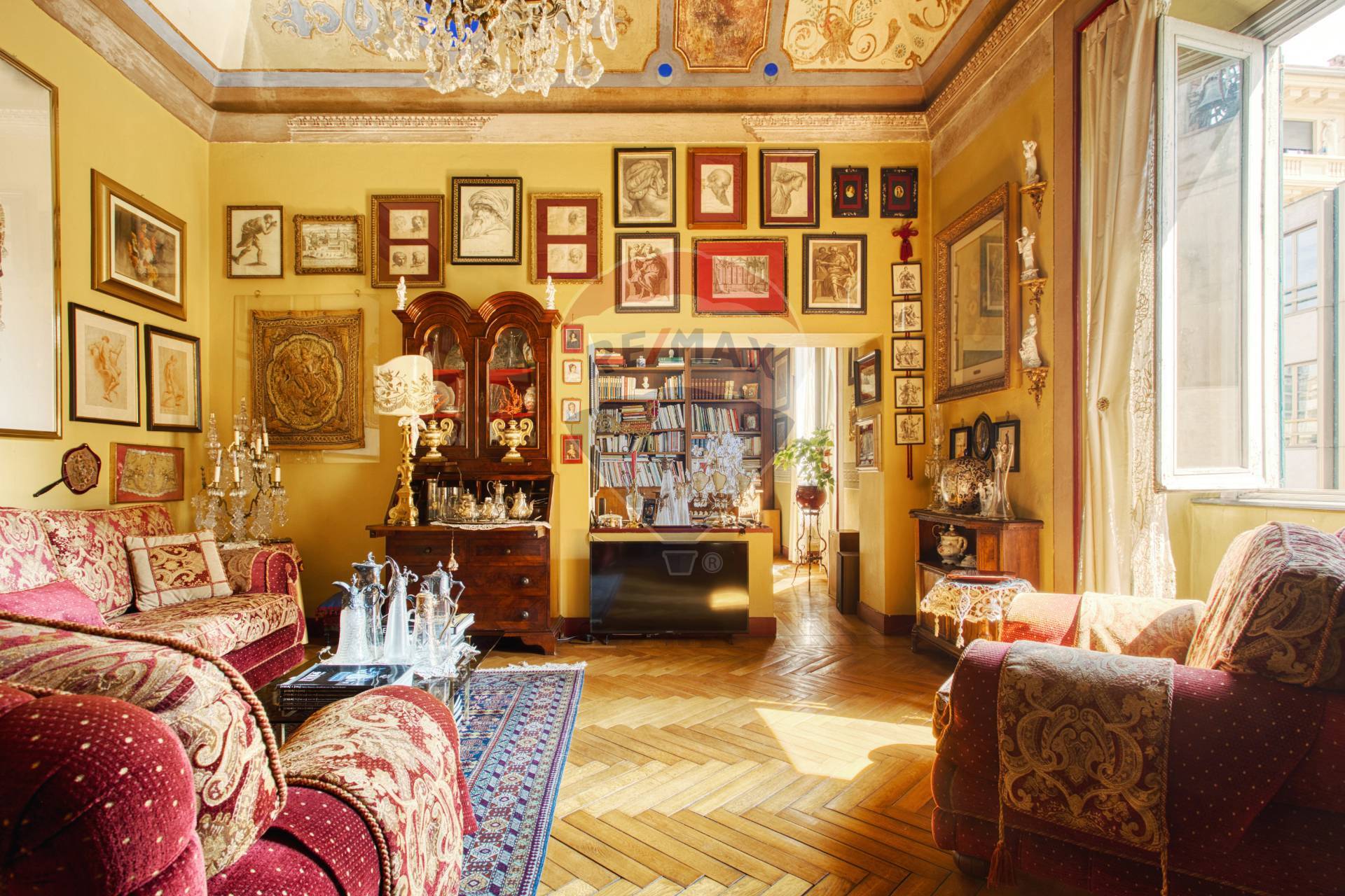 Entrando al piano nobile troviamo il corridoio dingresso, pavimentato in parquet a spina di pesce e arredato come una galleria darte, che distribuisce a tutti gli ambienti della zona giorno: il grande salone affacciato su Corso Cavour, ideale come soggiorno di rappresentanza o ampia sala da pranzo; una calda ed accogliente cucina abitabile rivestita in ceramiche blu e gialle con finestra panoramica; un intimo soggiorno/biblioteca con librerie su misura e uno studio con balcone sulla via principale, facilmente trasformabile in seconda camera matrimoniale.