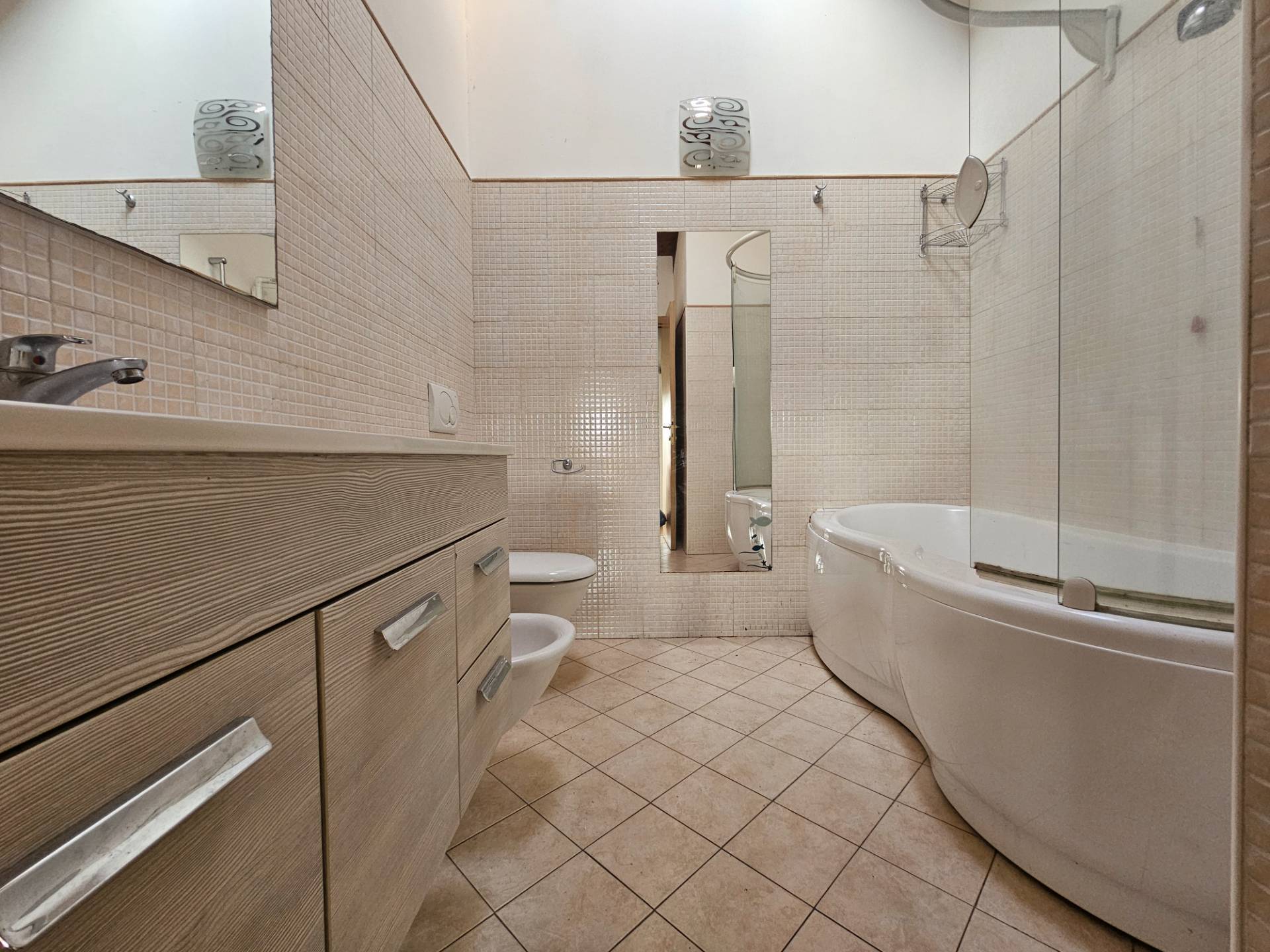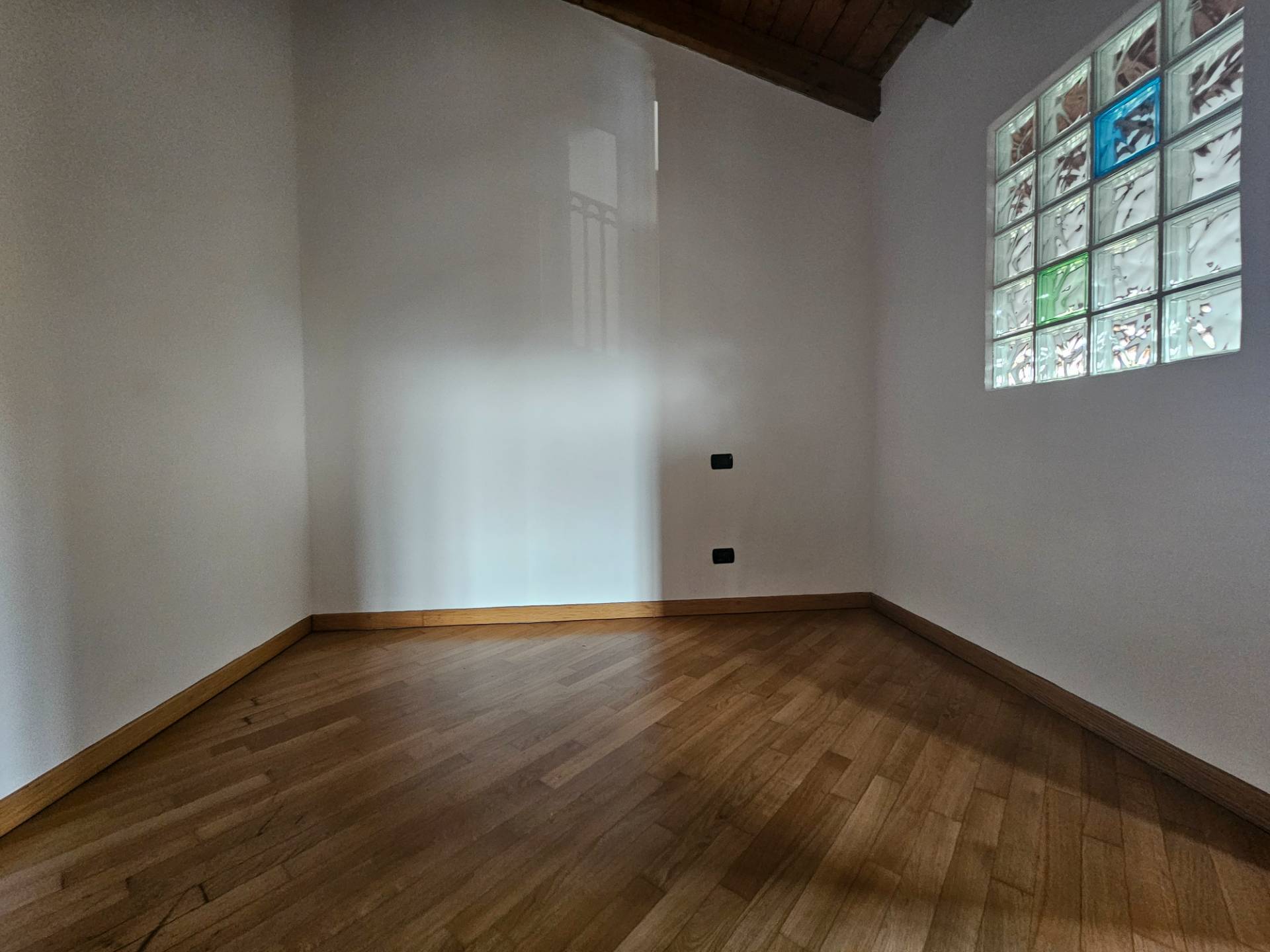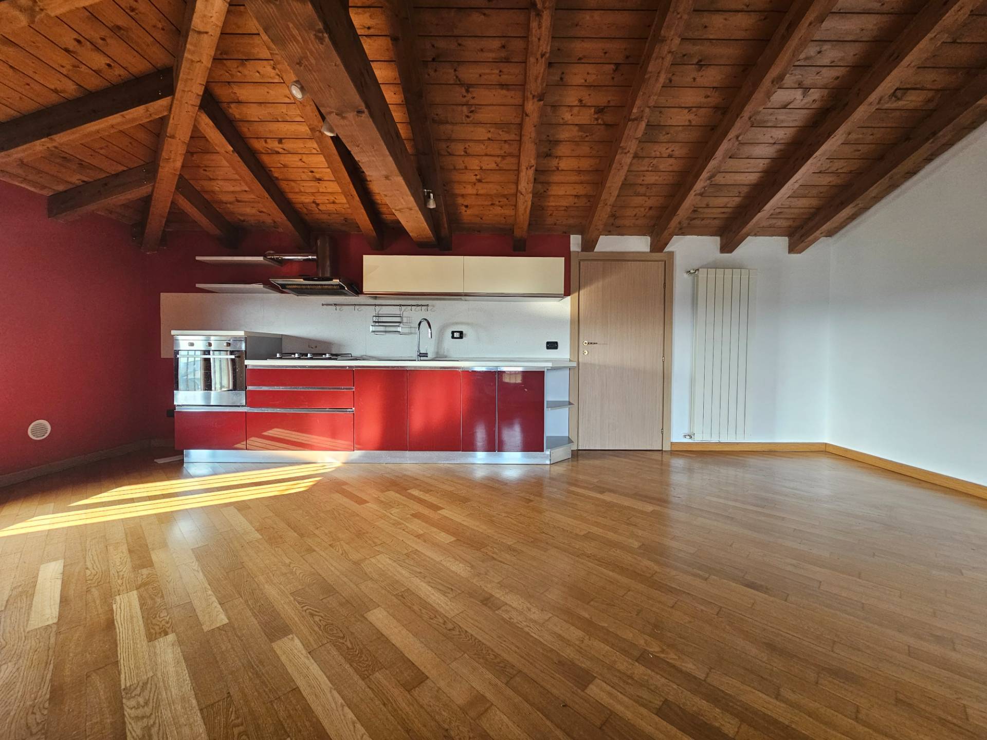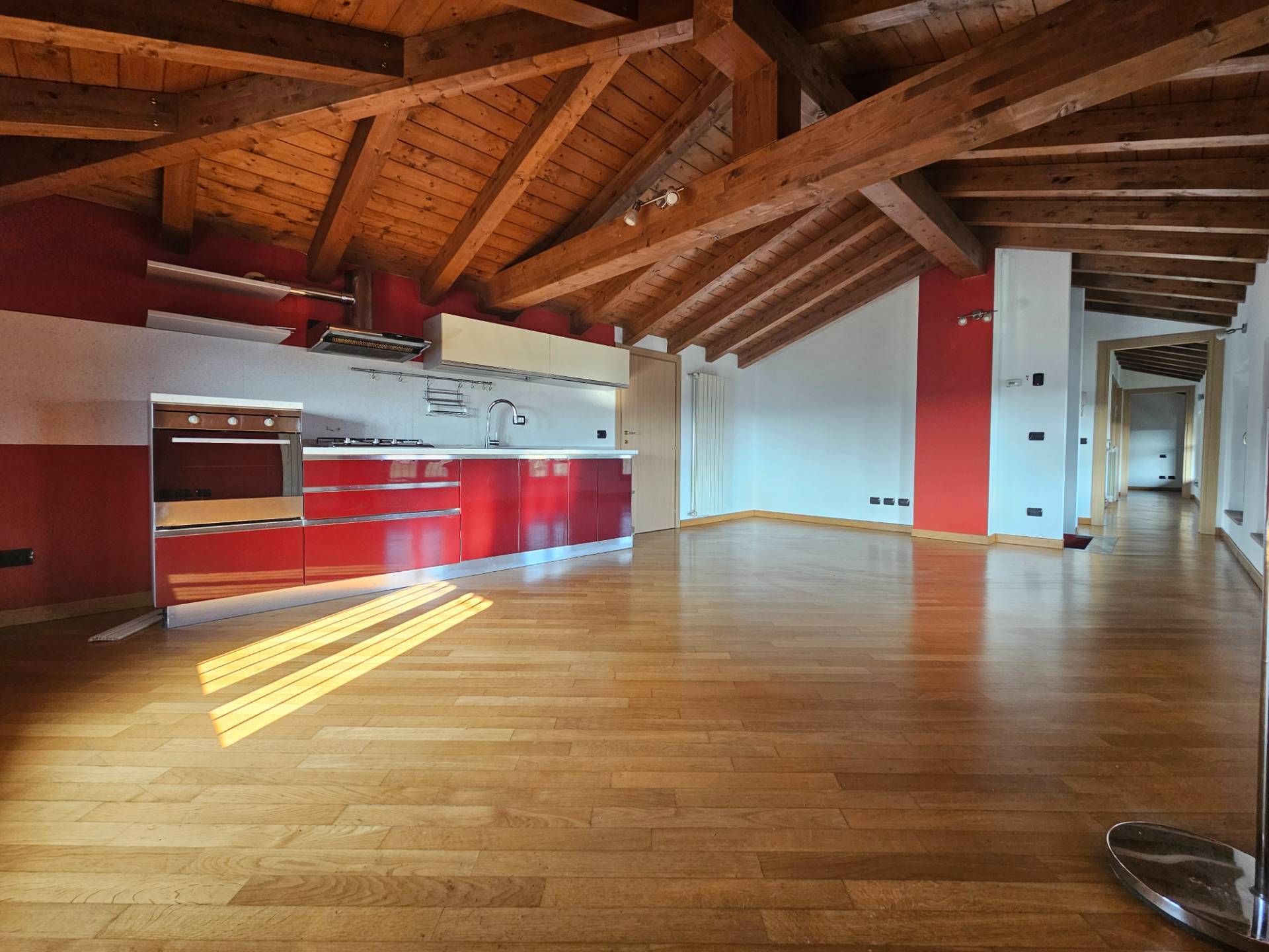 L'ingresso all'appartamento sulla spaziosa zona giorno, con cucina a vista e un primo bagno di servizio; il corridoio a disimpegno collega il soggiorno alla zona notte, composta da una prima camera/studio con collegamento ad un ampio ripostiglio sottotetto, il bagno con vasca e la camera matrimoniale.