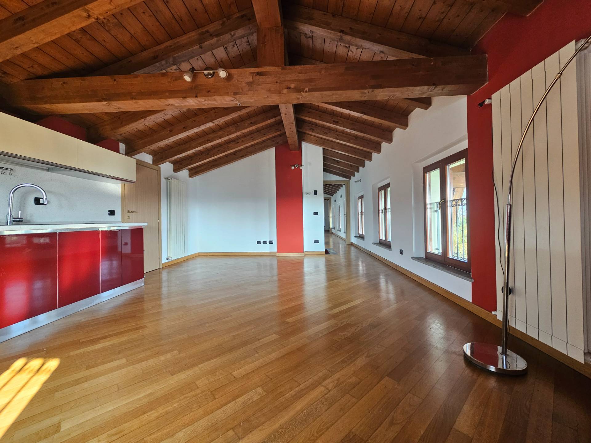 L'ottima esposizione rende lo spazio interno molto luminoso, caratterizzato dall'accogliente travatura a vista e la pavimentazione in parquet.