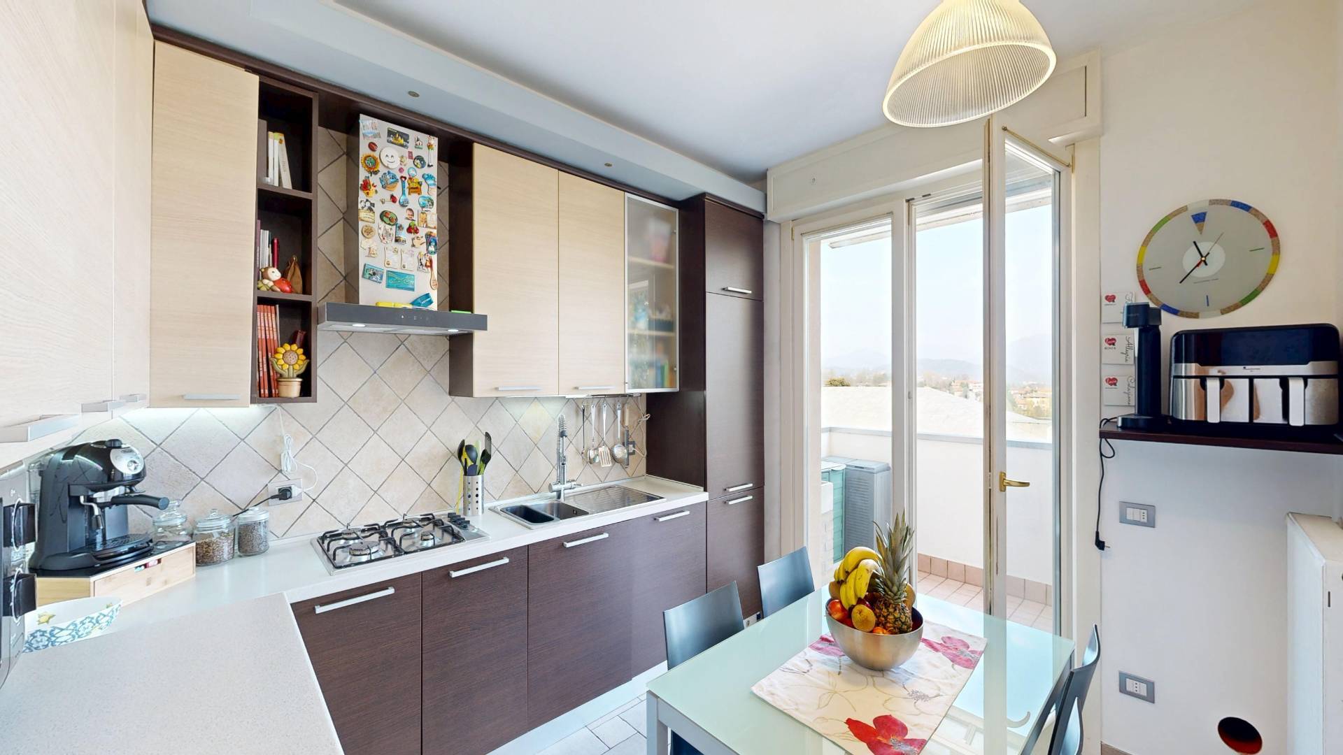 La cucina abitabile, separata e funzionale, con accesso diretto a un secondo sfogo esterno perfetto per pranzi e cene allaperto.