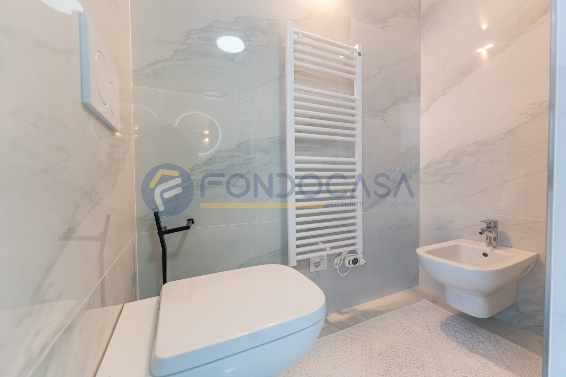 Zona Notte: Al piano superiore, la camera matrimoniale con cabina armadio Doppi Servizi & Lavanderia: Entrambi i bagni vantano sanitari sospesi dal design moderno.