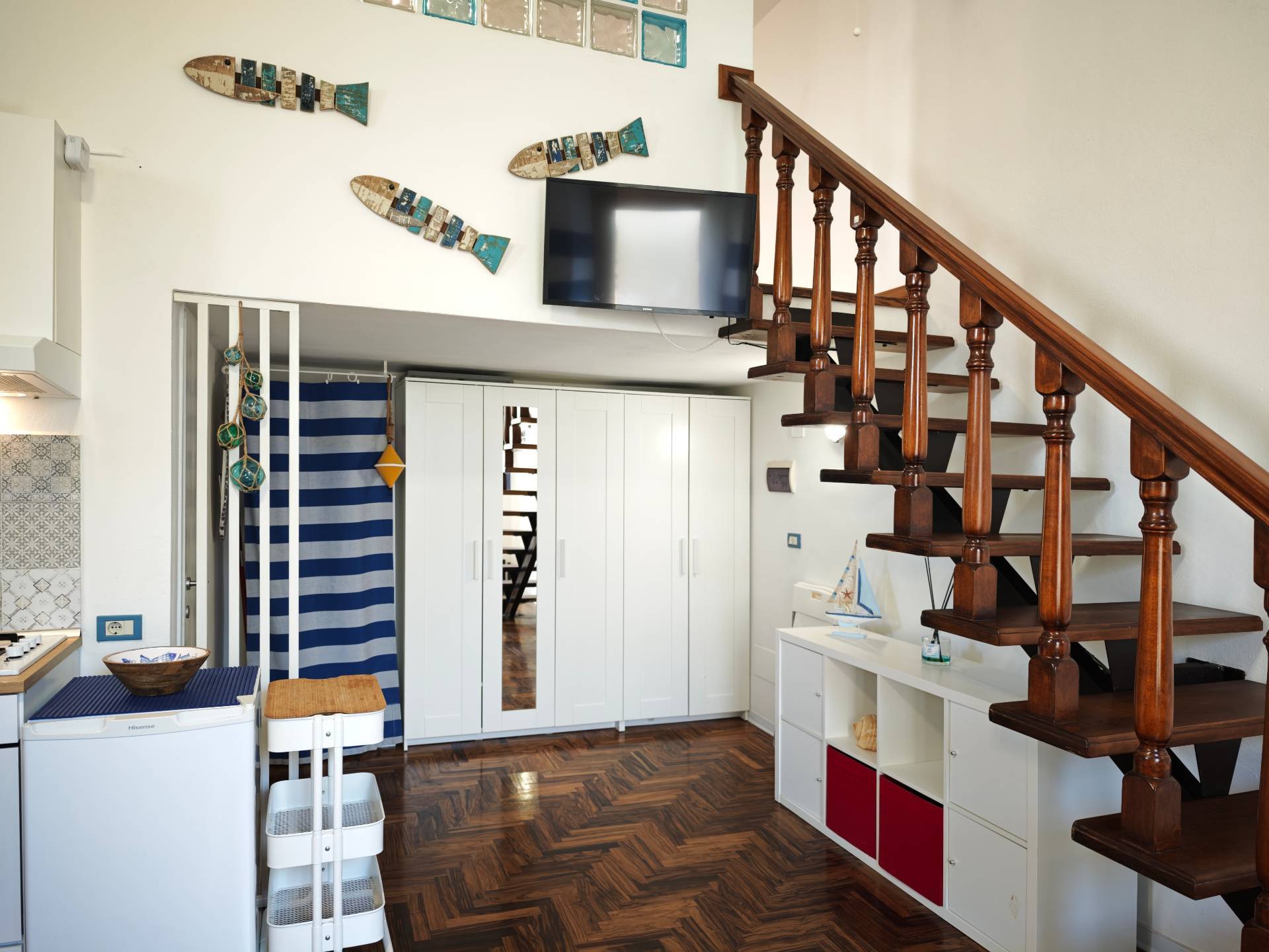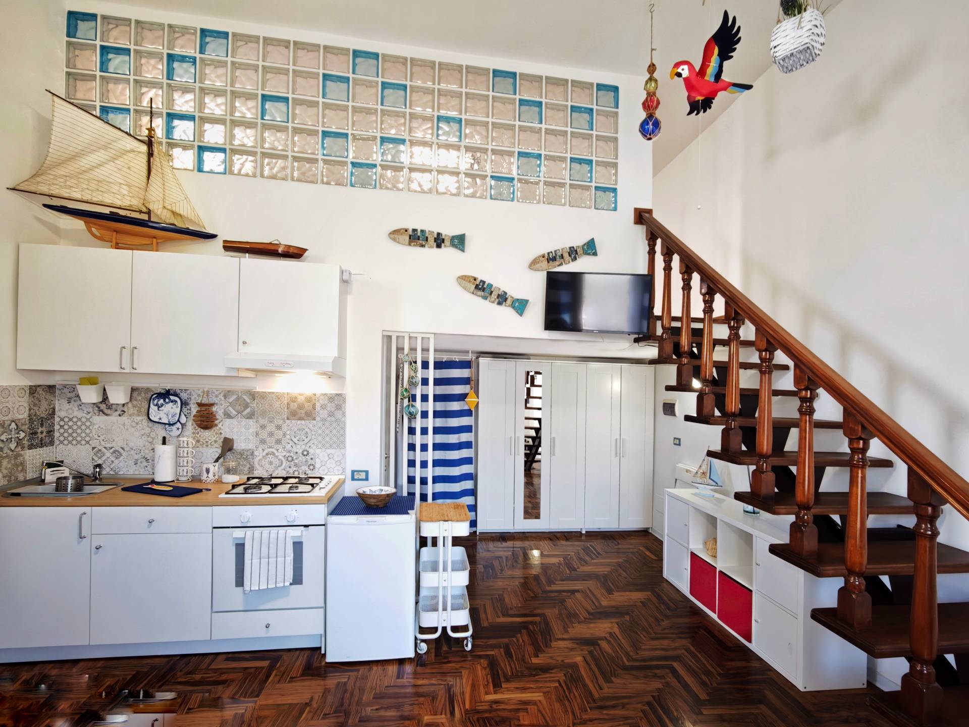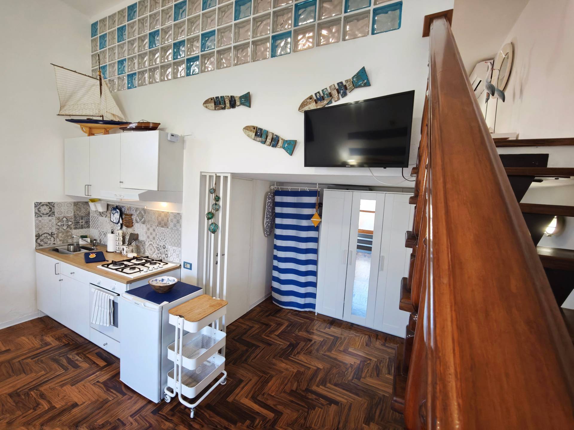 E un accogliente loft su due livelli, finemente ristrutturato e curato nei dettagli con uno stile marinaro moderno che richiama latmosfera del porto, proprio di fronte al quale si trova.