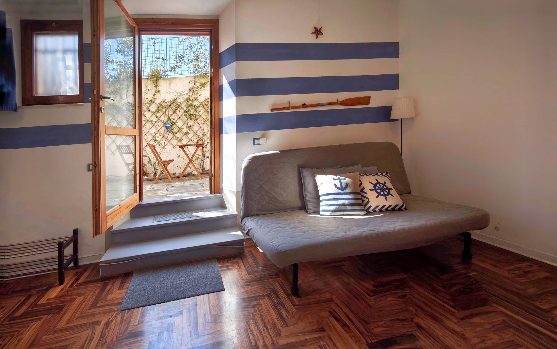 Lo spazio organizzato con grande funzionalit: Zona soggiorno con divano, tavolino e decorazioni a tema marino, come la parete a righe bianco-blu e lampade artigianali dal gusto nautico.