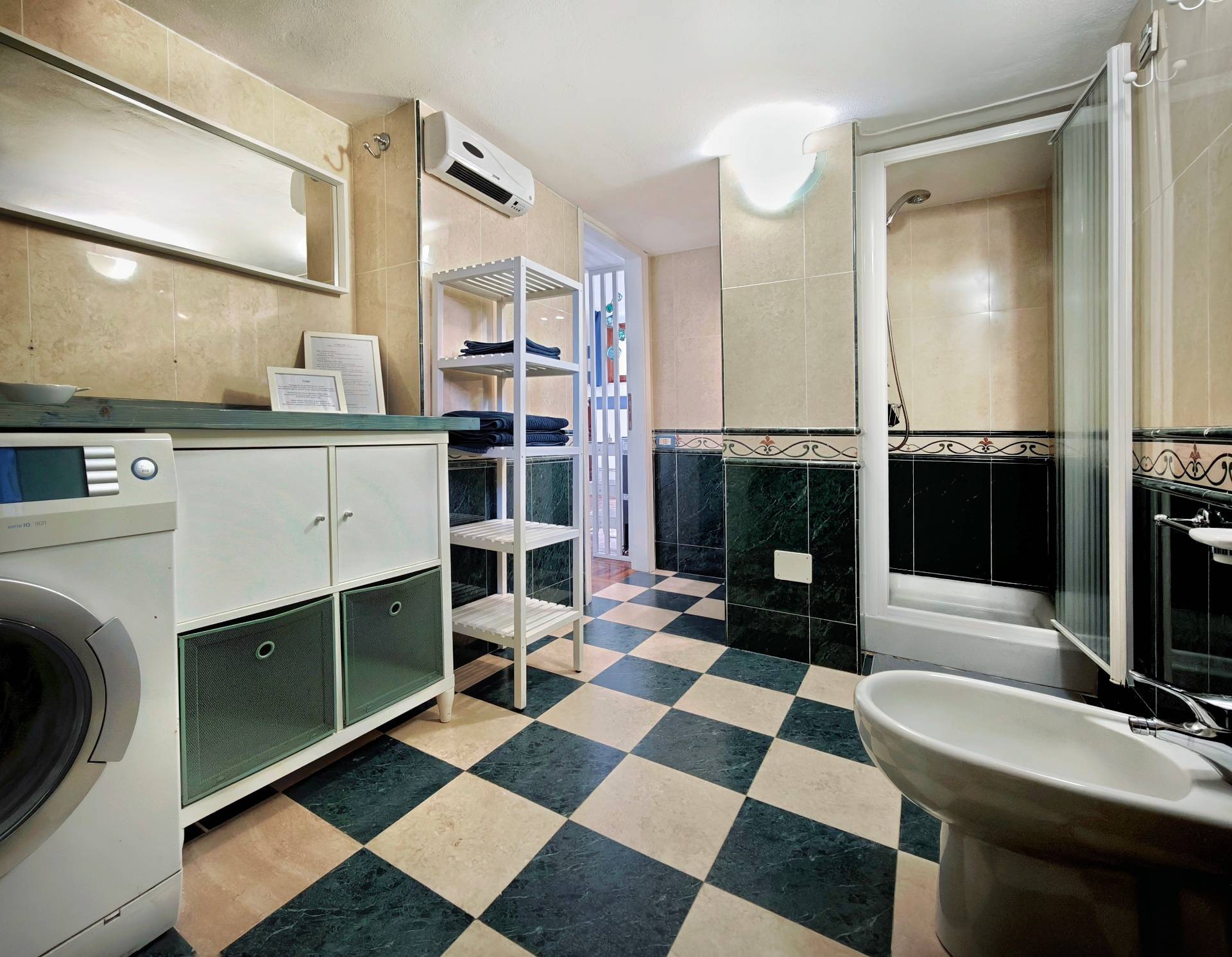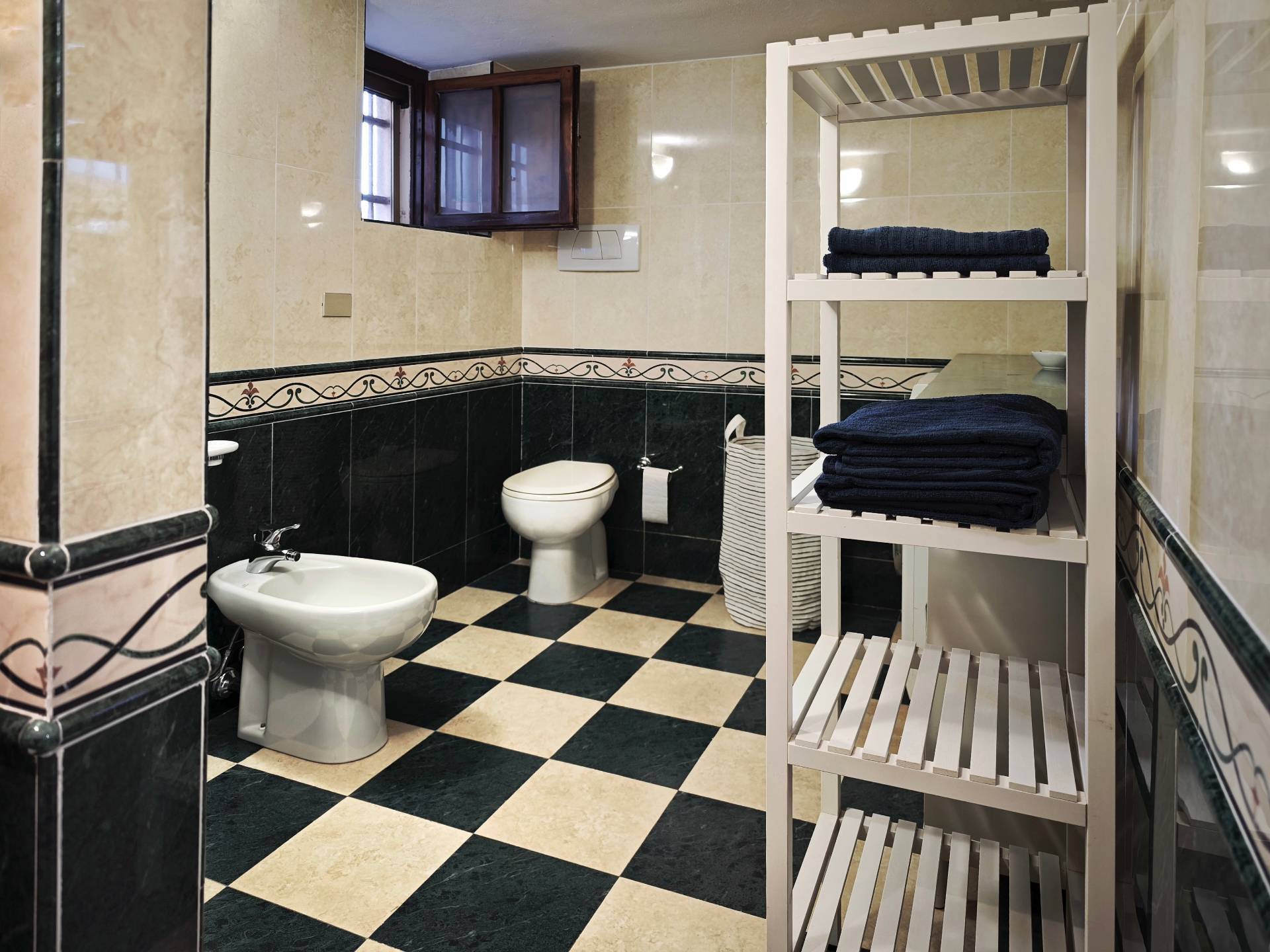 Bagno ampio finestrato, comodo, ben inserito nella disposizione del piano, con antibagno e dotato di lavatrice e box doccia . Scala in legno e piano superioreUna bella scala in legno scuro con ringhiera classica conduce alla zona notte situata sul soppalco.