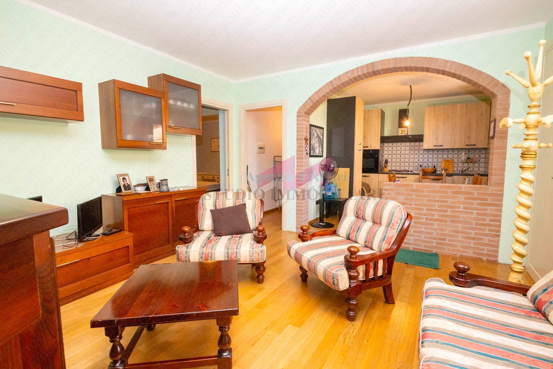 Labitazione, luminosa e ben distribuita, si compone di: ingresso su zona giorno con area living e cucina separata da caratteristico arco in mattoni a vista, disimpegno, ripostiglio/centrale termica due camere da letto matrimoniali, bagno finestrato con box doccia.