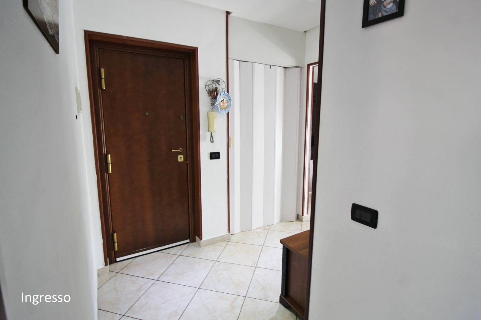 L'ingresso che ospita un armadio a muro conduce ad un salone doppio con due balconi ed una finestra, corridoio, due camere da letto, ripostiglio, bagno con doccia, cucina con veranda e doppio angolo cottura.
