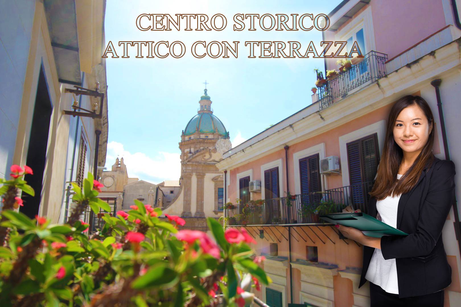 Attico con Terrazza Centro storico Riferimento: 3735 Prezzo: euro 365.000 Vani : 6 Superficie: 264 mq Classe energetica : F - APE 188,10 kWh/mq anno In via Nino Basile, nel centro storico di Palermo, a ridosso della chiesa di Casa Professa, all'interno del percorso arabo normanno, in una zona in forte espansione da un punto di vista turistico, proponiamo in vendita un ampio e panoramico esavani di 260 mq, posto al terzo piano senza ascensore, all'interno di un edificio costruito a met dell'700 circa.