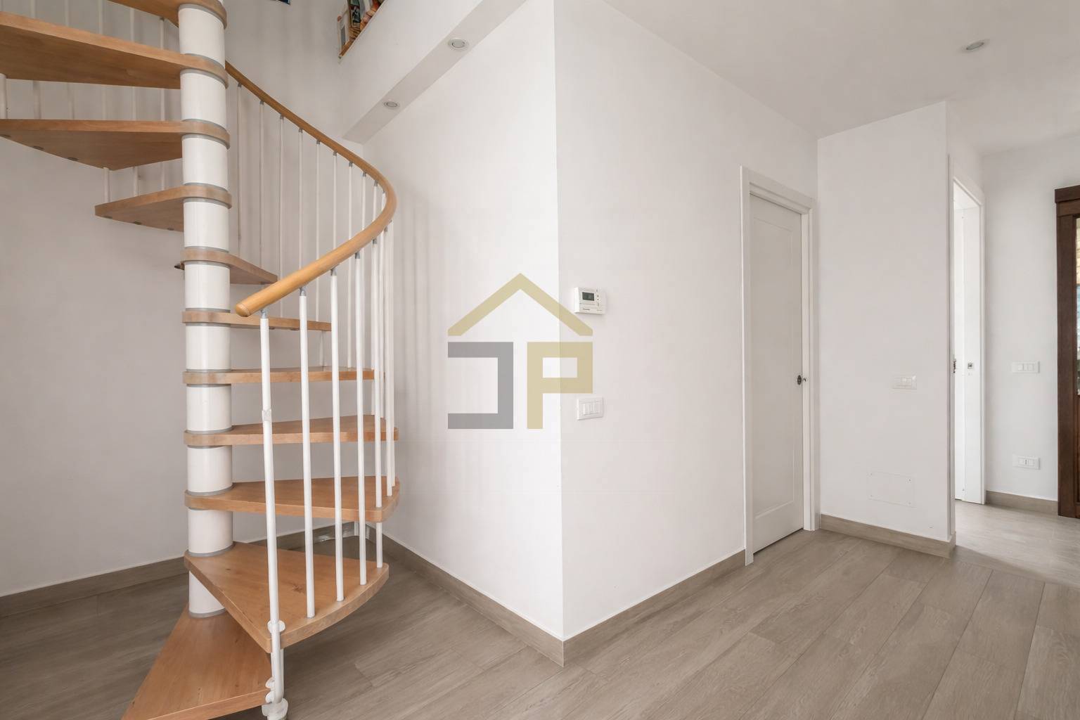 Gli infissi sono in pvc con vetrocamera, porte in legno laccato bianco, scala interna in legno.