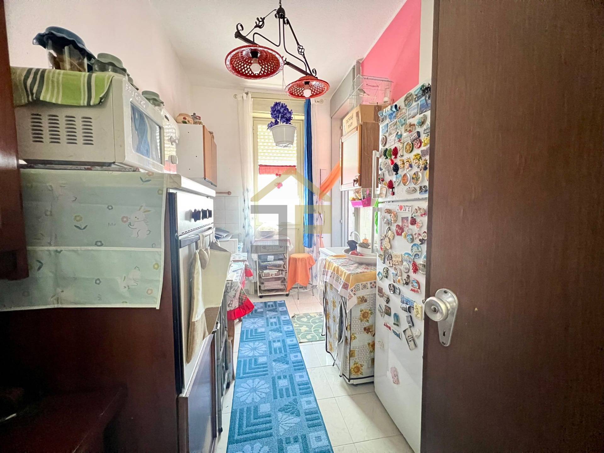 Limmobile si apre su un comodo ingresso che conduce al disimpegno, da cui si accede a un ampio e luminoso salone e a una cucina abitabile con veranda.
