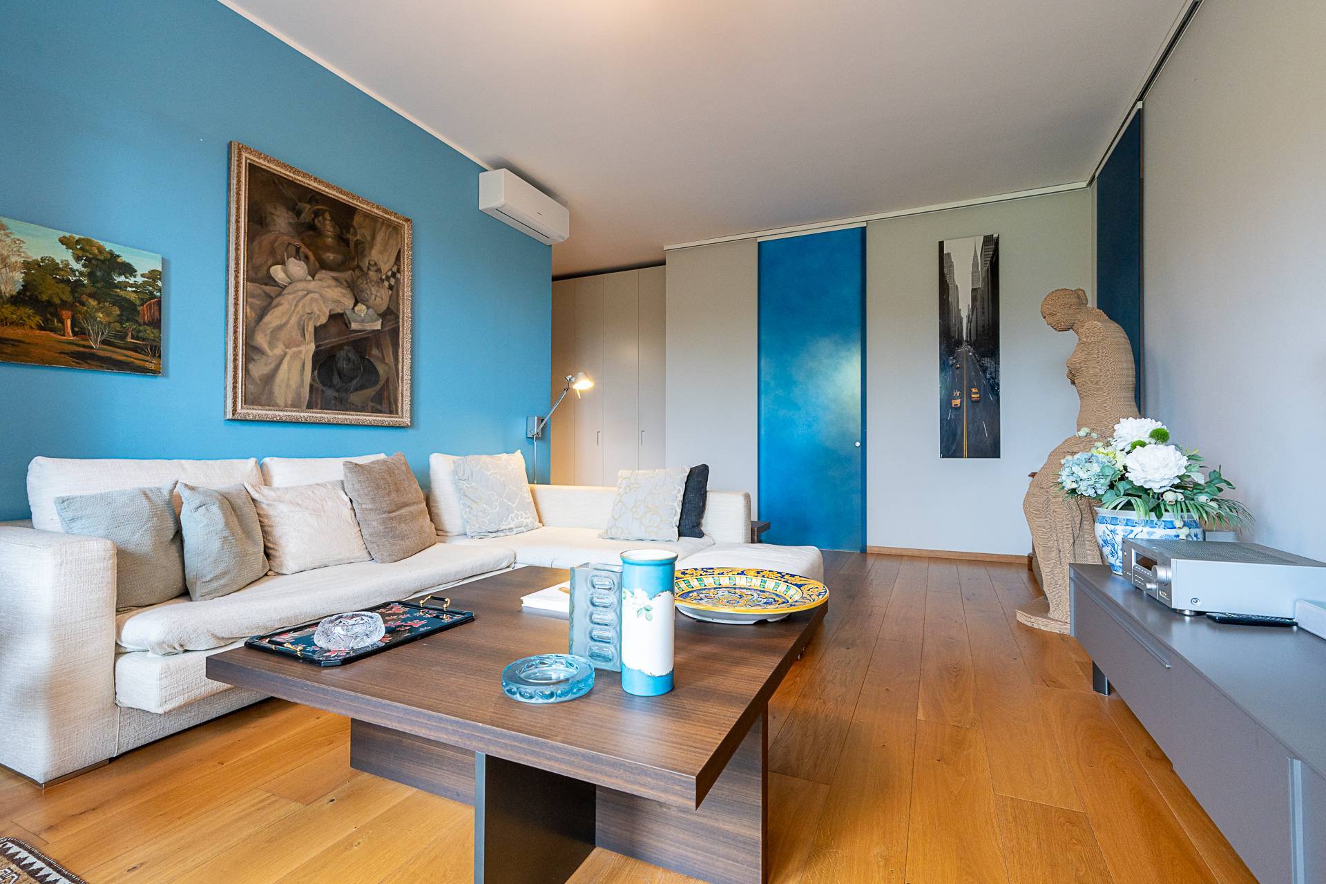 Lingresso conduce a un raffinato soggiorno living con ampi balconi panoramici e splendida vista sulle colline.