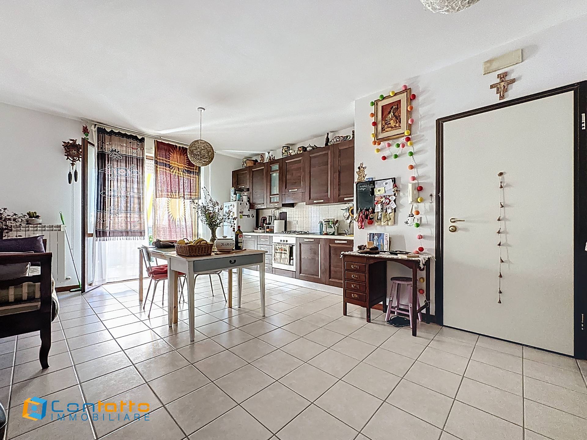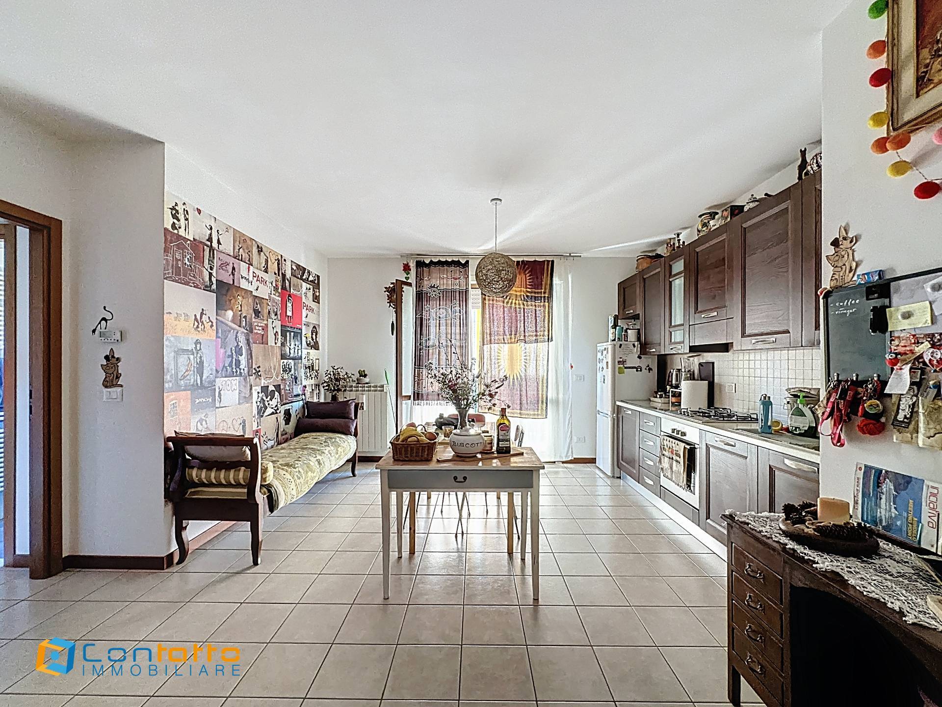 Lappartamento si apre su un luminoso soggiorno con angolo cottura, perfetto per creare un ambiente conviviale e rilassante.