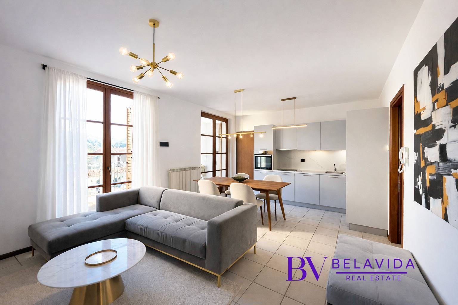 La zona giorno comprende un soggiorno luminoso con accesso all'ampio terrazzo con parziale vista lago e centro storico, ideale per momenti di relax, e angolo cucina.