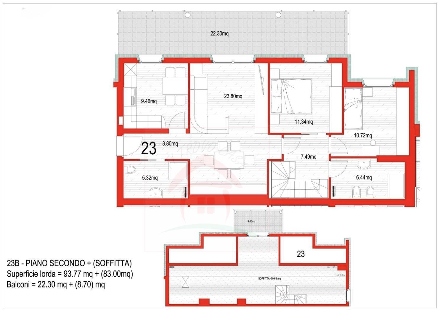 Da una scala interna si raggiunge il piano superiore, accatastato come soffitta, in cui possibile ricavare un'ampia suite con bagno privato, accesso al secondo balcone e una capiente cabina armadio.