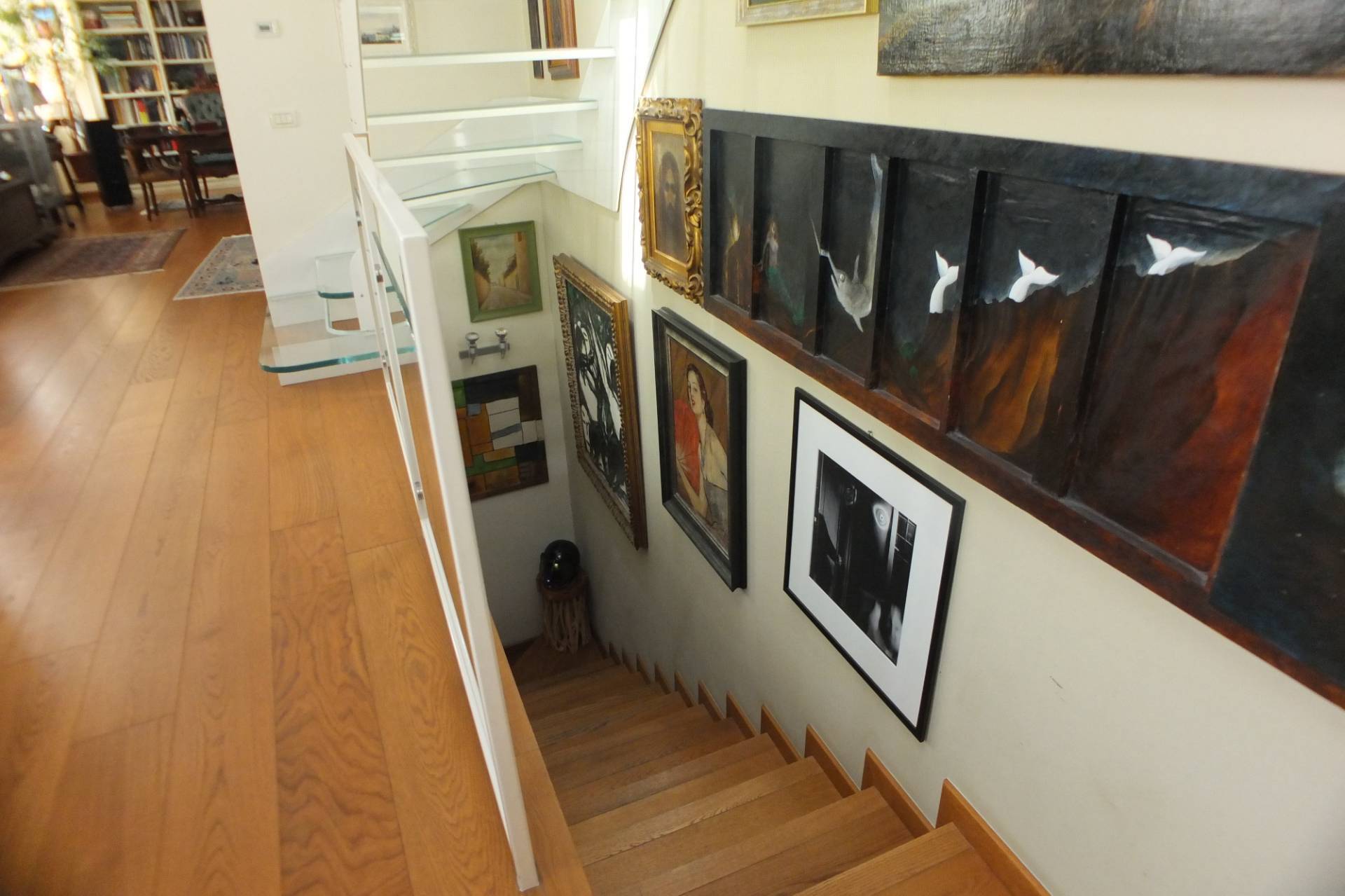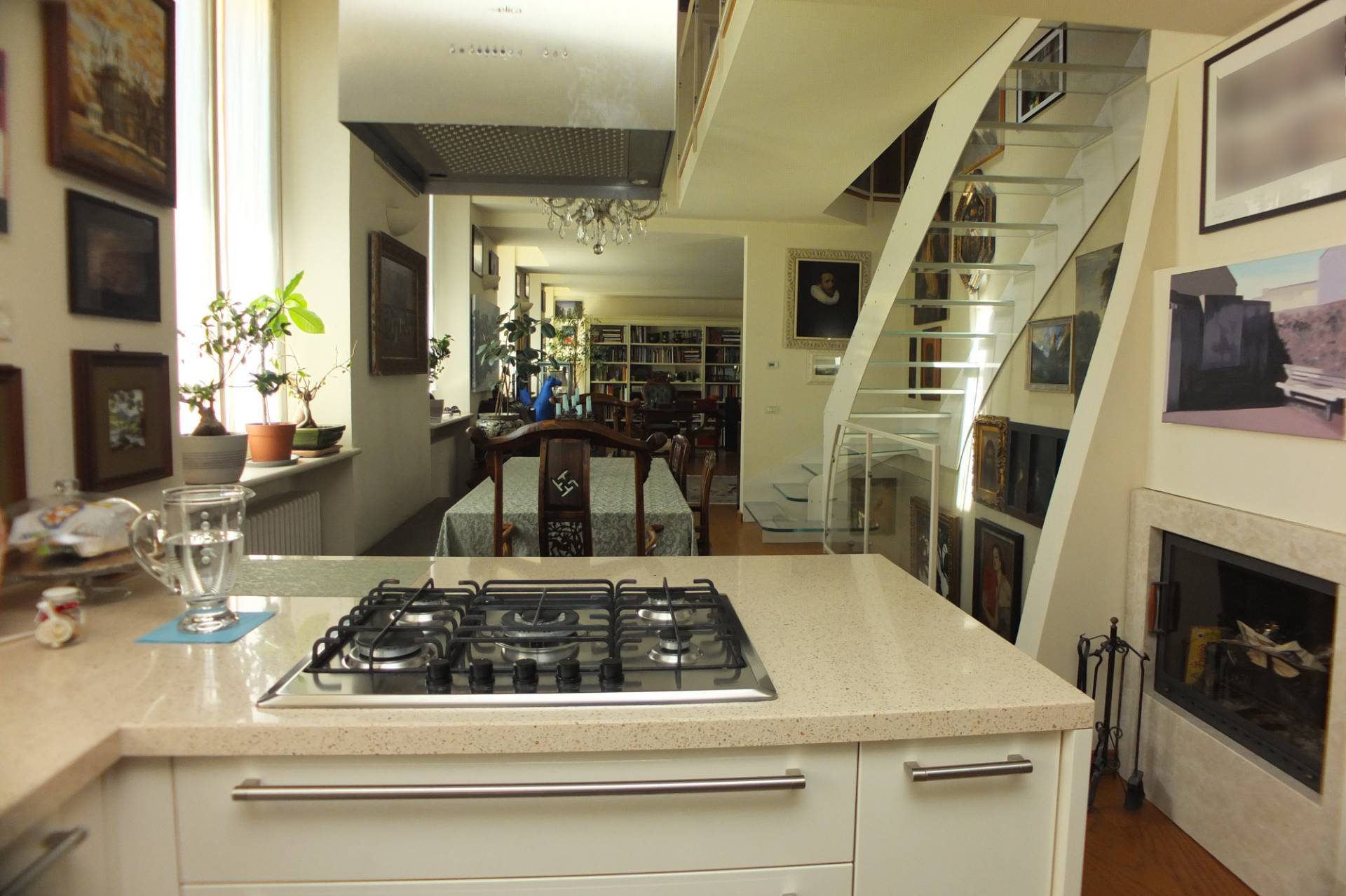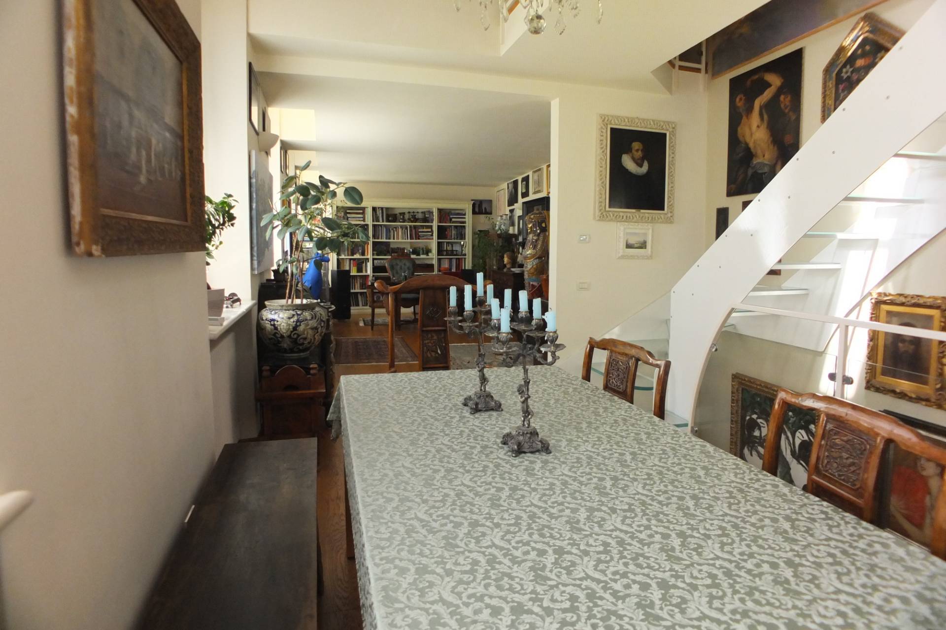L'appartamento composto di ingresso, scala in legno che accede ad una ampia zona giorno con cucina a vista, ampia sala da pranzo con zona divani e studio, un disimpegno che accede ad un bagno finestrato ed una lavanderia, al piano mansarda, collegato con una scala di design in vetro troviamo due vani ampi utilizzati come camere matrimoniali ed un ulteriore vano adibito a w,c. lavanderia sempre finestrato.