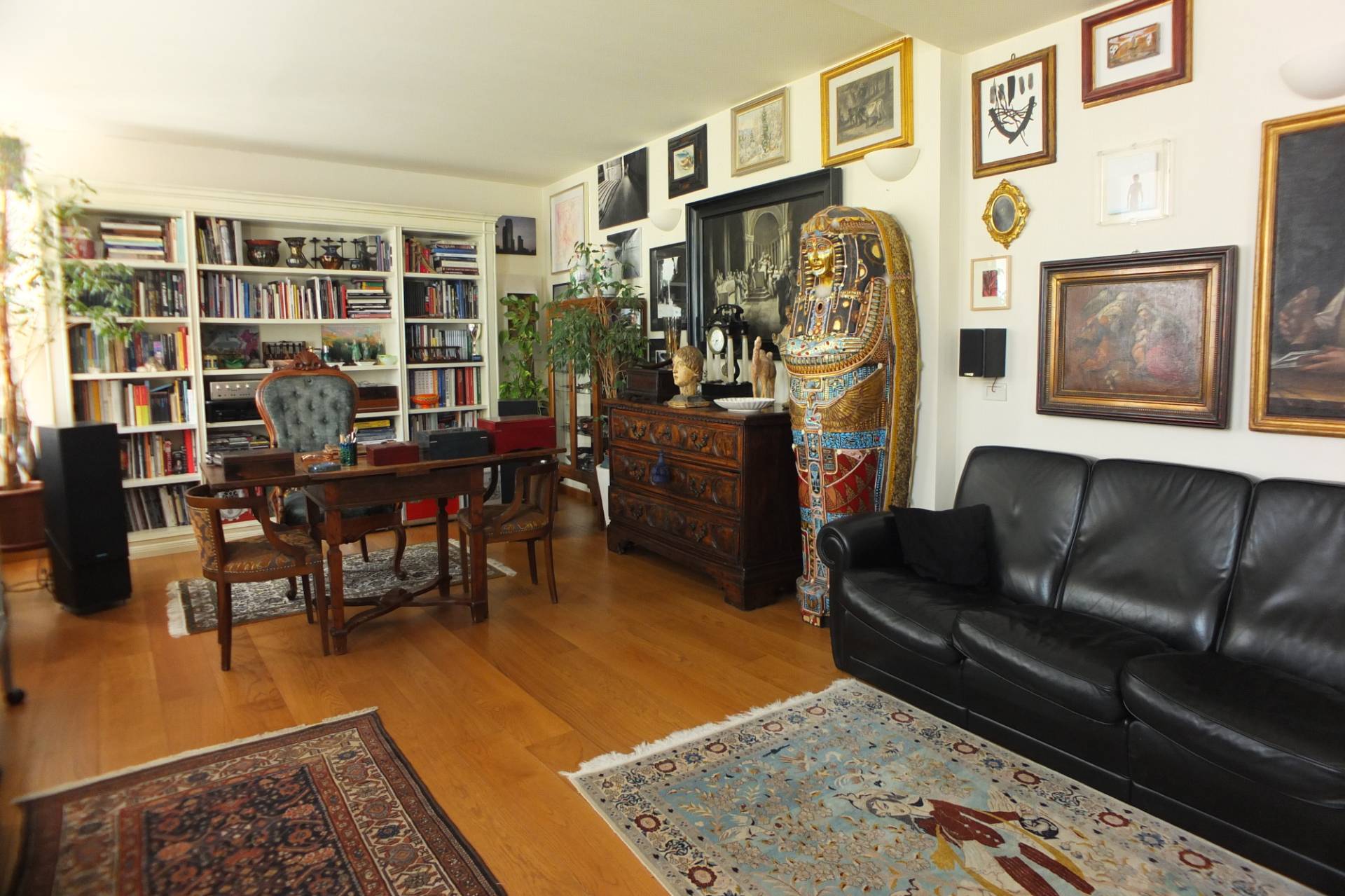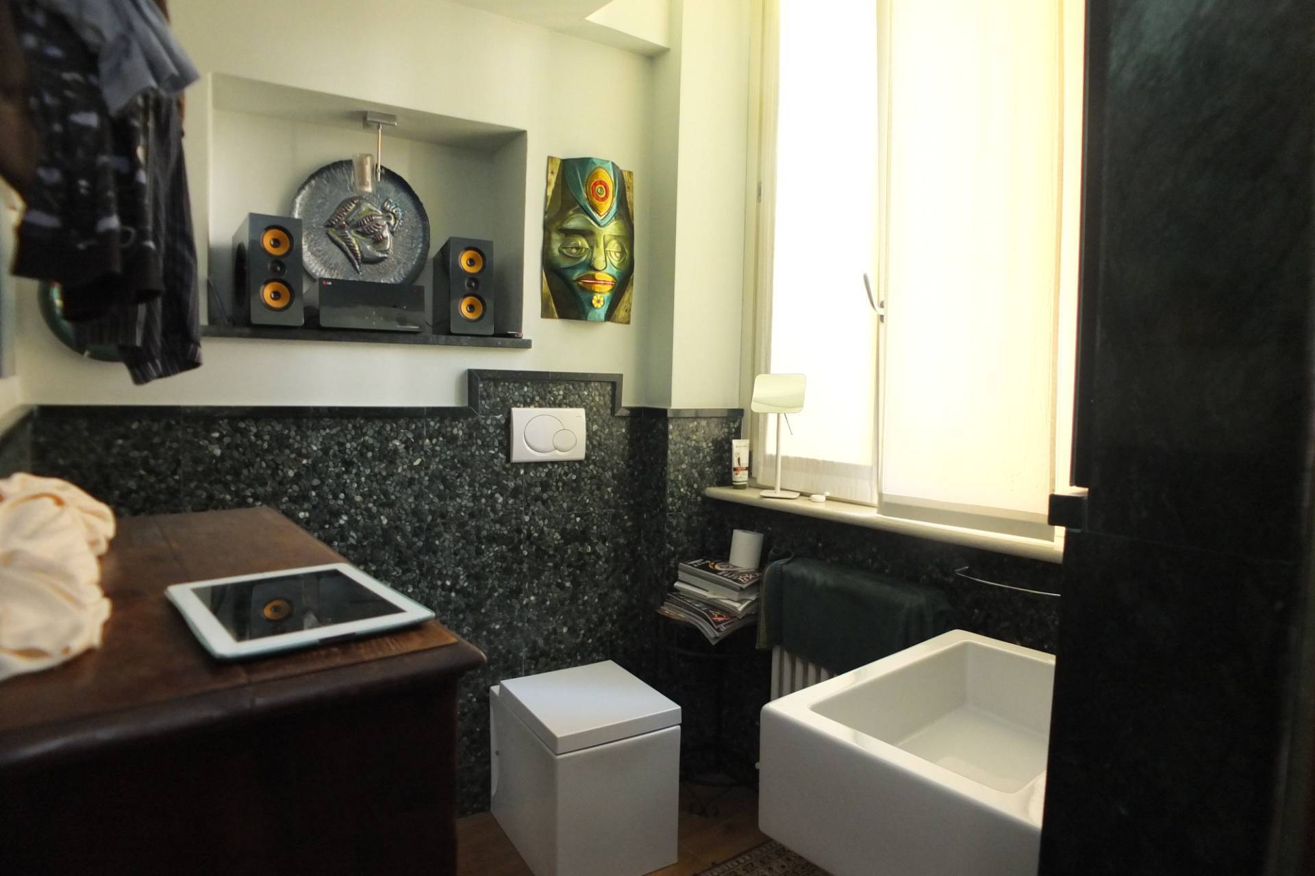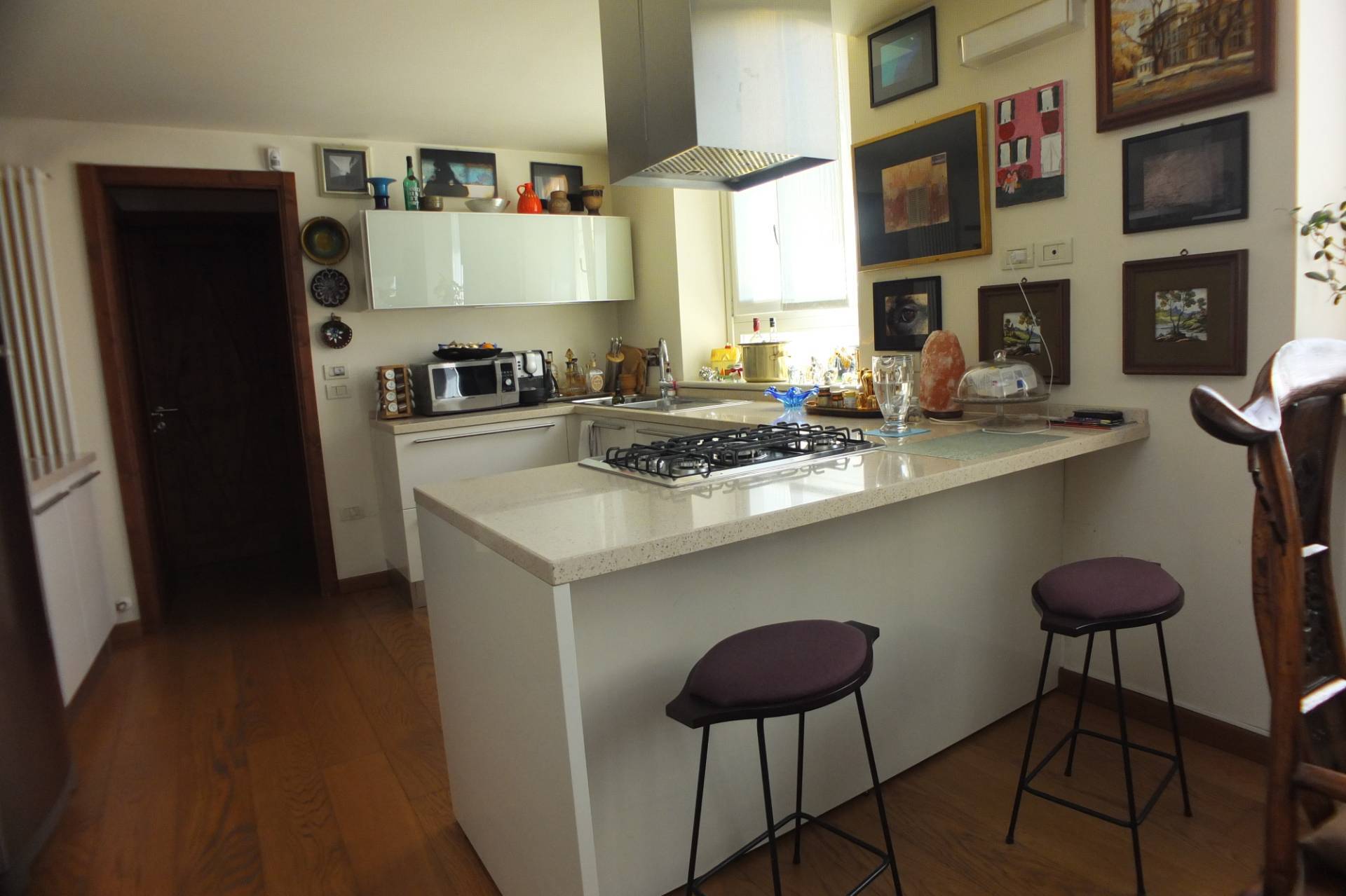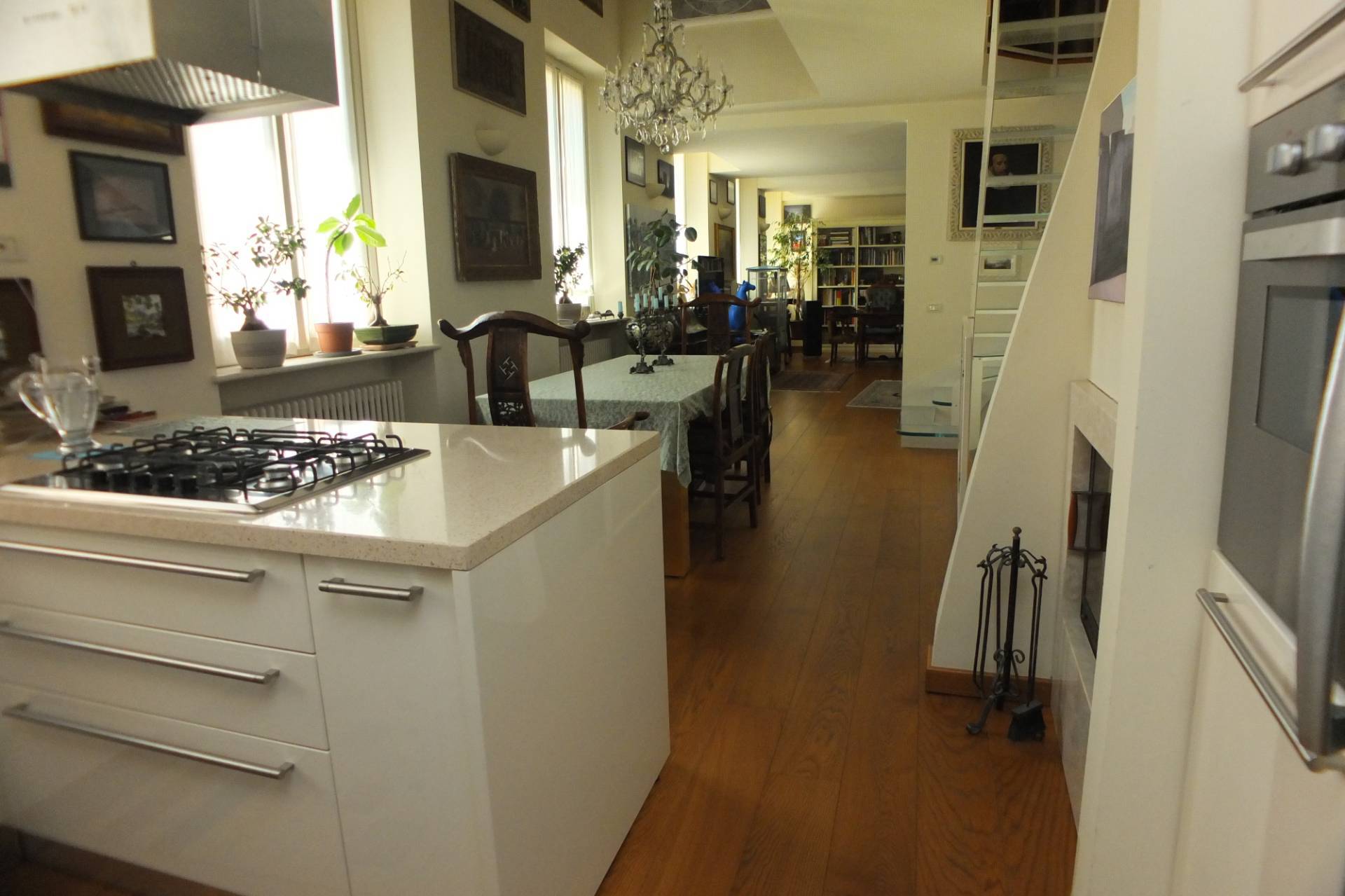 L'appartamento composto di ingresso, scala in legno che accede ad una ampia zona giorno con cucina a vista, ampia sala da pranzo con zona divani e studio, un disimpegno che accede ad un bagno finestrato ed una lavanderia, al piano mansarda, collegato con una scala di design in vetro troviamo due vani ampi utilizzati come camere matrimoniali ed un ulteriore vano adibito a w,c. lavanderia sempre finestrato.