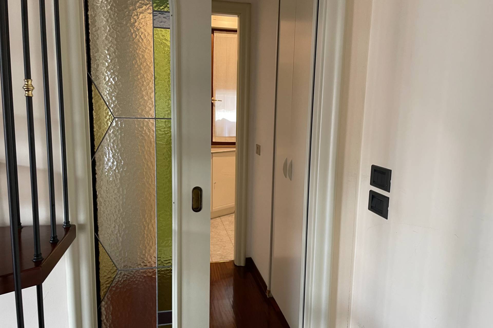 L'immobile, completo di arredamento, si compone al piano secondo di un ingresso, un ampio soggiorno con grande vetrata con gradevole vista sui tetti del centro storico e del verde condominiale, una cucina abitabile, un disimpegno, una camera con un terrazzino ed un bagno con doccia; dal soggiorno, con comoda scala in legno, si sale al secondo livello (piano sottotetto) dove troviamo due ampi vani che possono essere sfruttati come due camere di grandi di dimensioni di cui una con terrazza, ed una ampia lavanderia oltre alle comode armadiature su misura che si trovano nei due vani. La propriet, in ottime condizioni, con impianti autonomi, aria condizionata, libera subito.