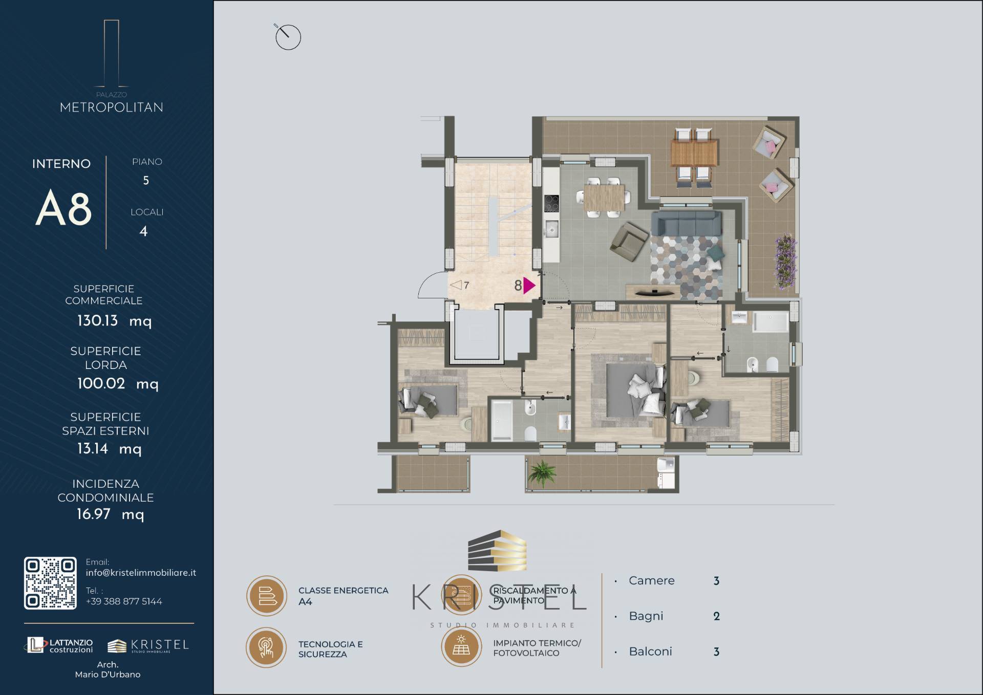 L'immobile rappresenta una nuova concezione di abitare basata sull'impiego di materiali e fonti di energia rinnovabili che permettono all'acquirente un consistente risparmio sui consumi ; inoltre dotato di struttura in cemento armato antisismico, cappotto perimetrale, coibentazioni termo acustiche, serramenti termici in pvc, domotica, videocitofono, telefono, tv satellitare, impianto radiante a pavimento, aria condizionata ed impianto fotovoltaico condominiale.