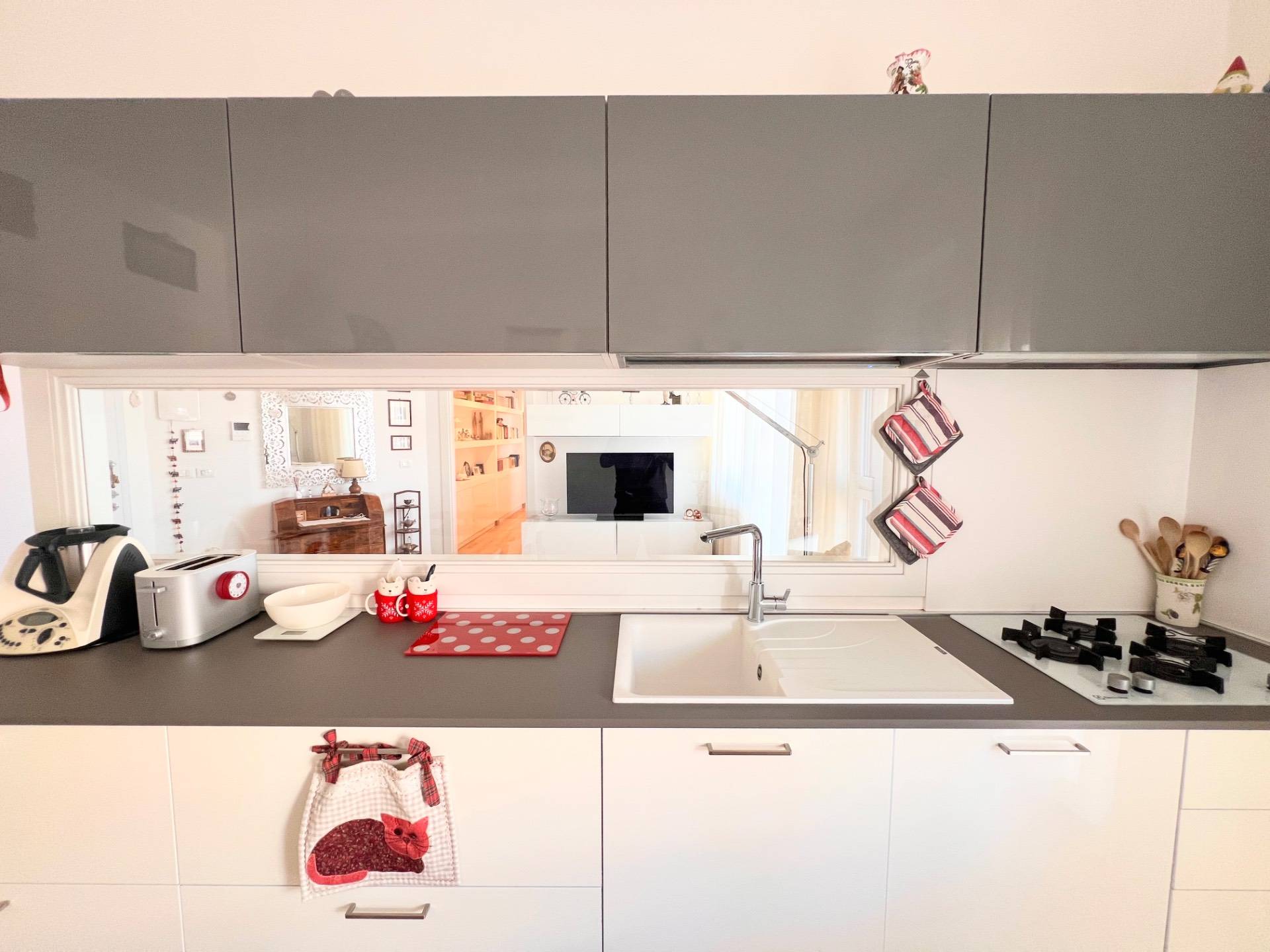La doppia esposizione e i due balconi regalano una vista aperta su mare e monti, rendendo l'appartamento luminosissimo e confortevole in ogni ora del giorno.