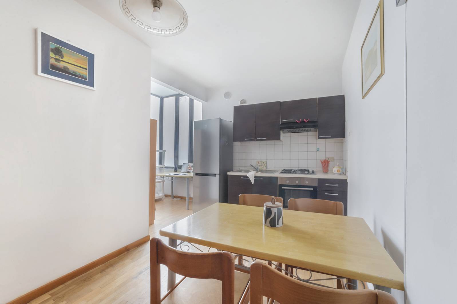 Giunti sul pianerottolo del piano primo e varcato l'uscio d'ingresso dell'appartamento, ci accoglie uno spazioso e accogliente open space ben organizzato con la cucina disposta in uno spazio dedicato.