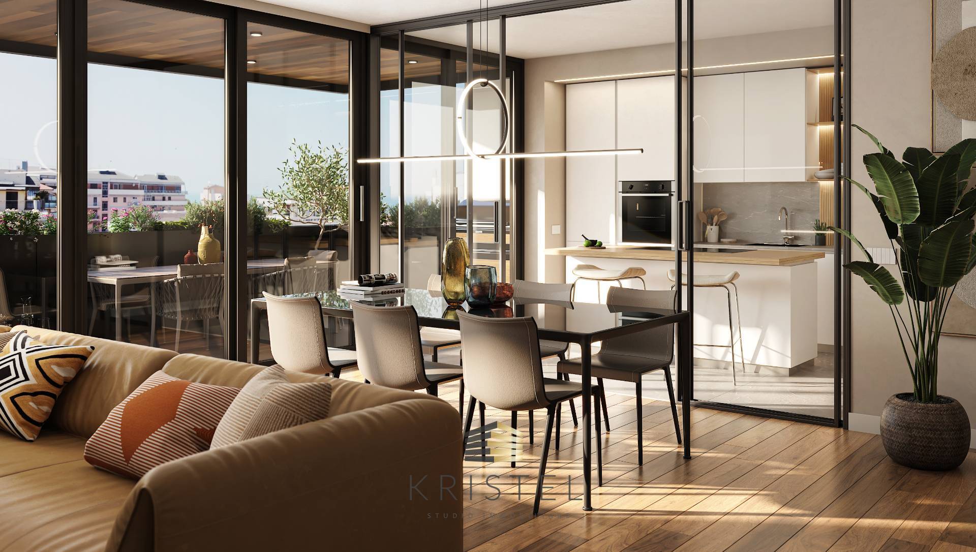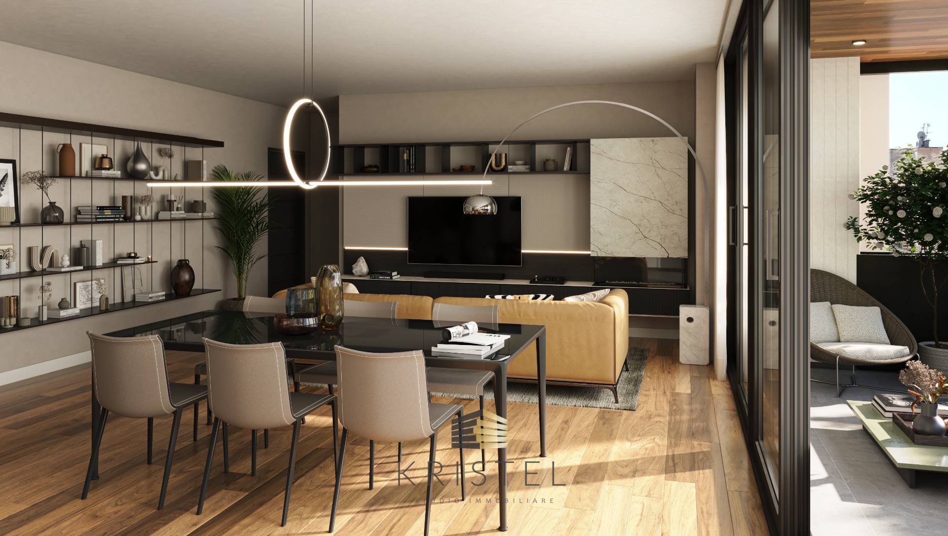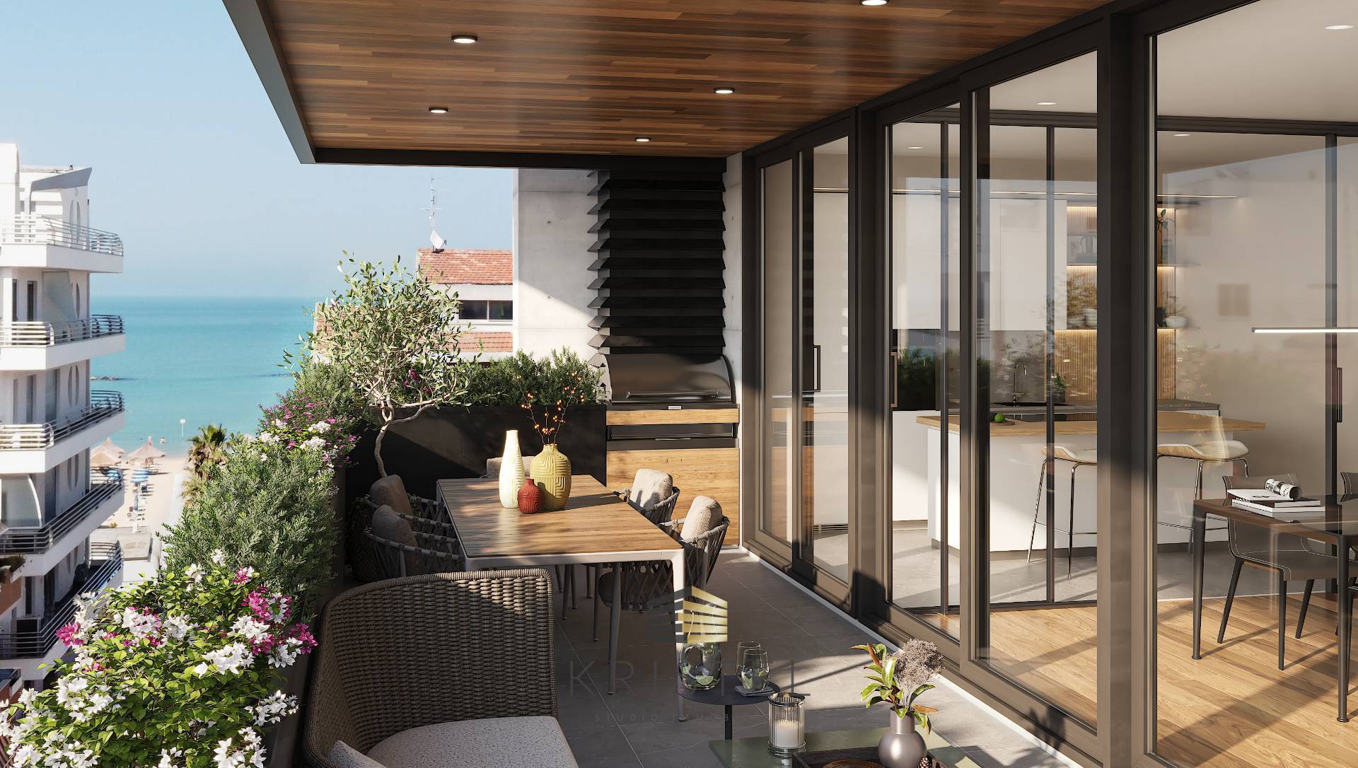 Nella zona giorno un ampio serramento a tutta parete invita ad un bellissimo terrazzo abitabile che con un arredo giardino permette di trascorrere sereni momenti in compagnia immersi nel verde e allietati dalla brezza marina.
