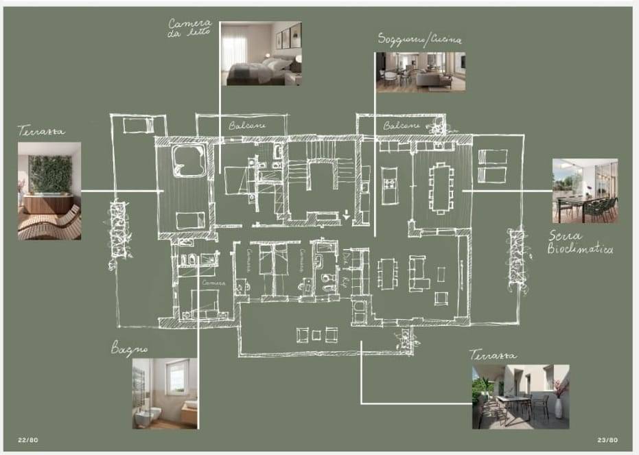 La distribuzione interna degli spazi prevede una magnifica zona living di circa 60 mq, completata da una serra bioclimatica, di circa 21 mq, che contribuisce al miglioramento del bilancio energetico dell'attico.