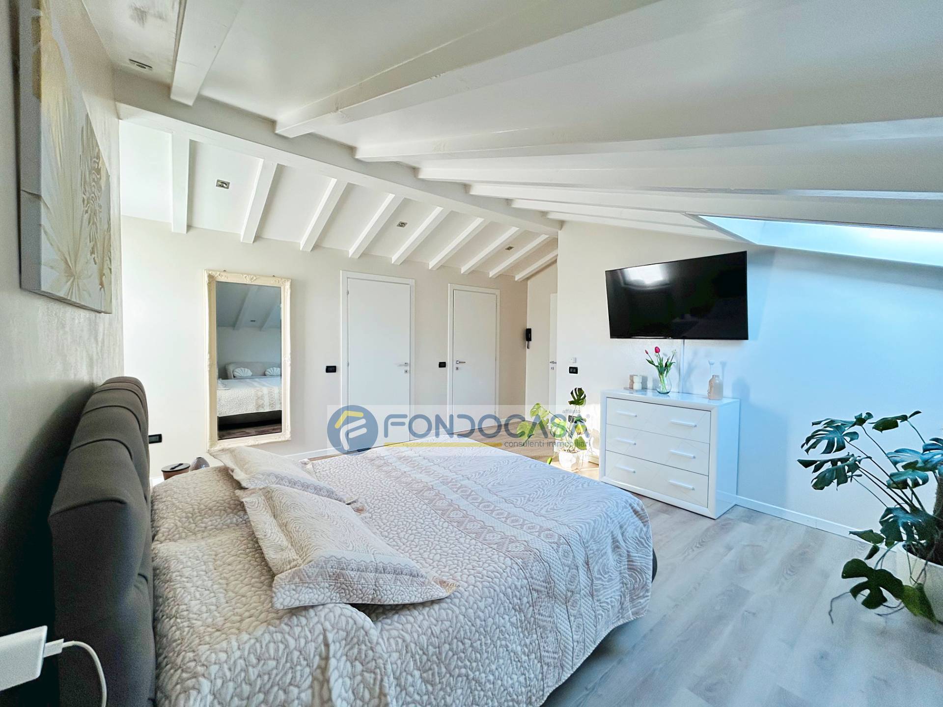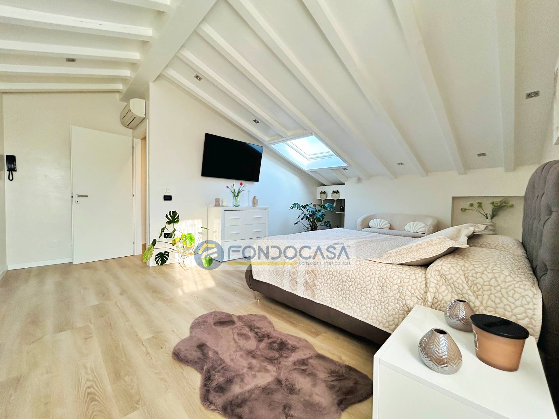 Una scala interna conduce al piano superiore, dove si sviluppa la splendida camera padronale con travi a vista, dotata di guardaroba e bagno dedicato.