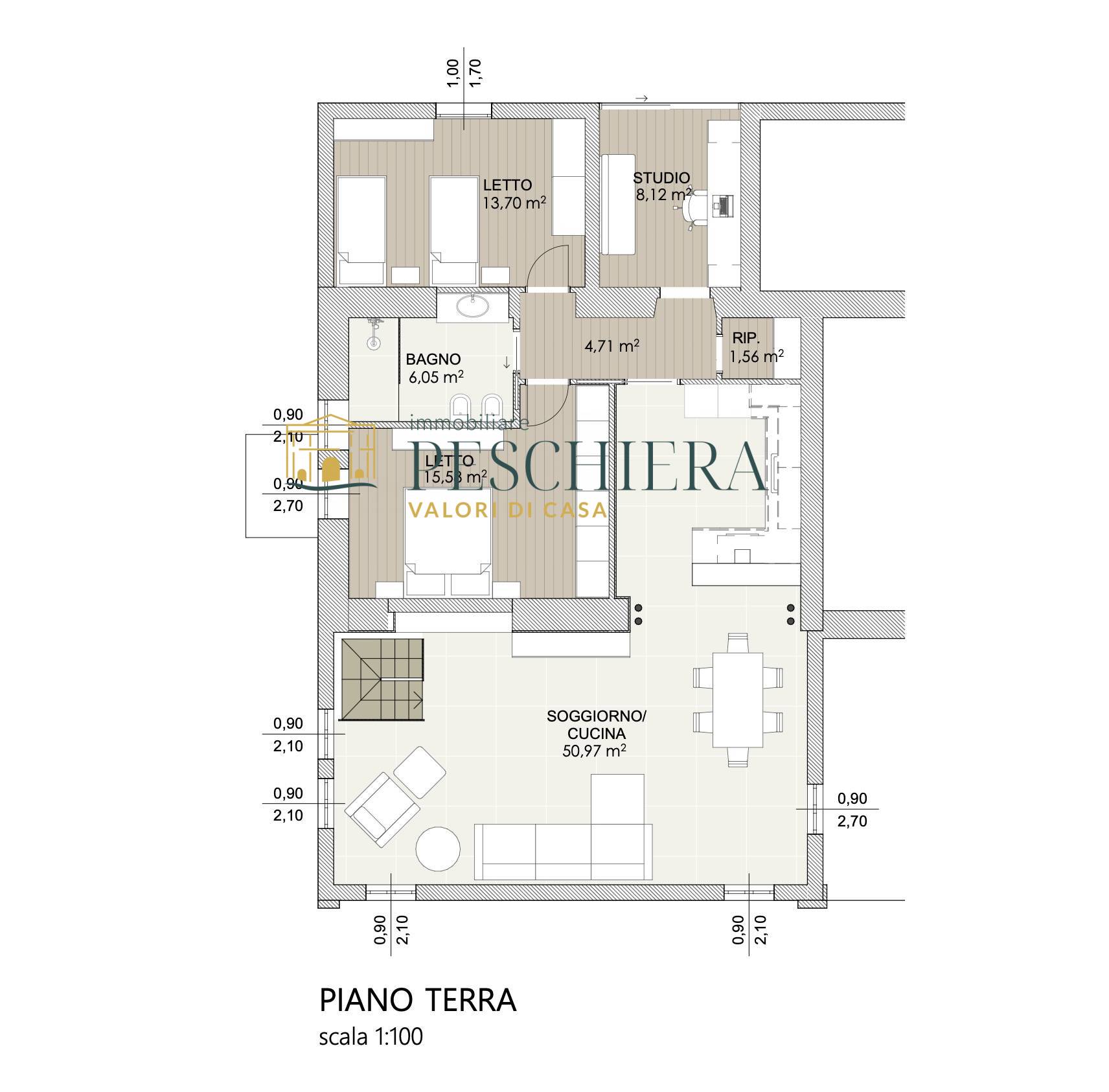Lappartamento offre la possibilit di essere trasformato in una residenza accogliente e funzionale, con ingresso, unampia zona giorno di circa 50 mq che integra soggiorno e angolo cottura, disimpegno, ripostiglio, camera matrimoniale, camera doppia, studio e bagno.