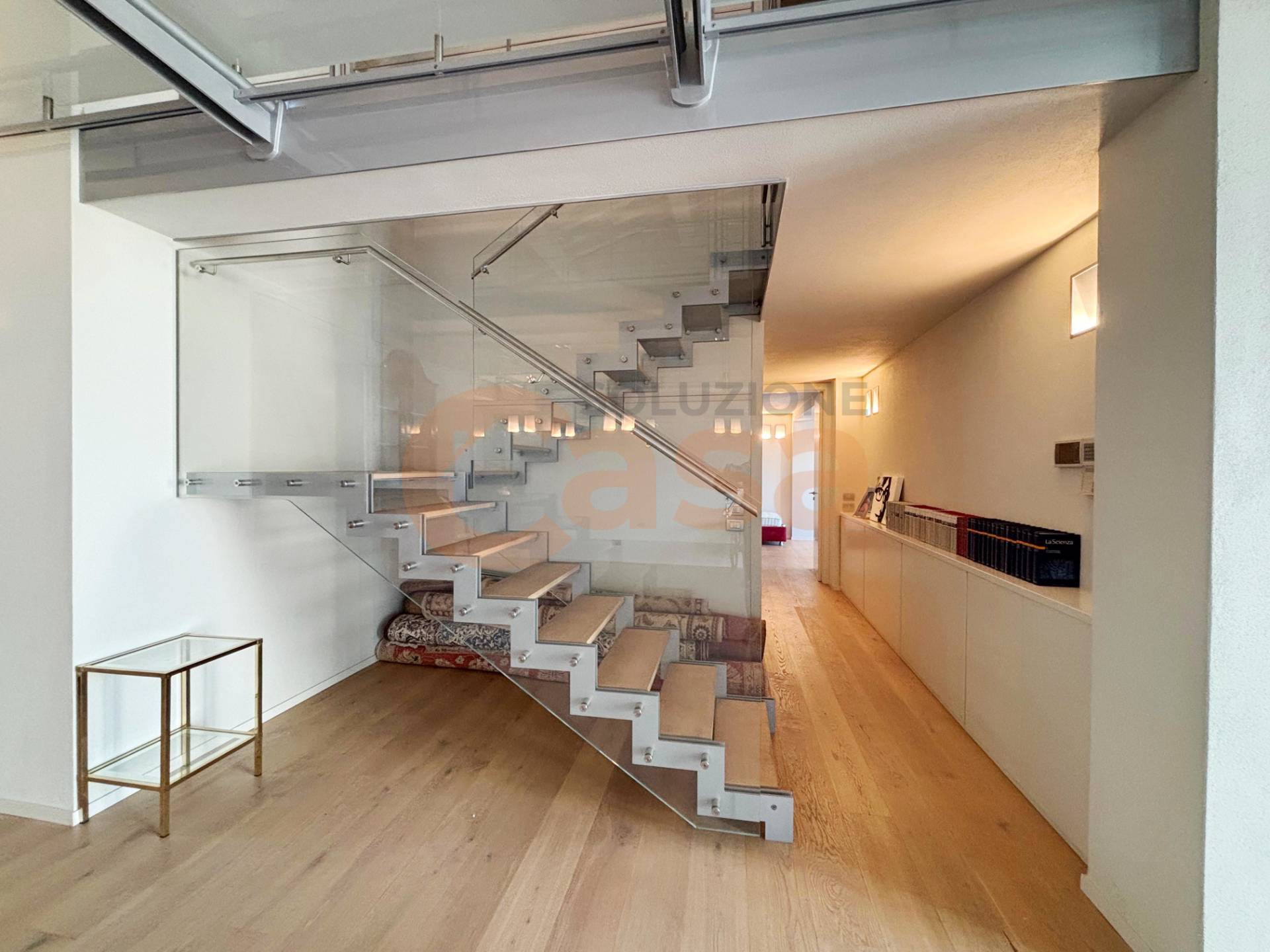 L'appartamento disposto su due livelli per complessivi 273 mq, molto luminoso grazie alle pareti vetrate su entrambi i livelli ed impreziosito da una leggera scala in vetro di design.